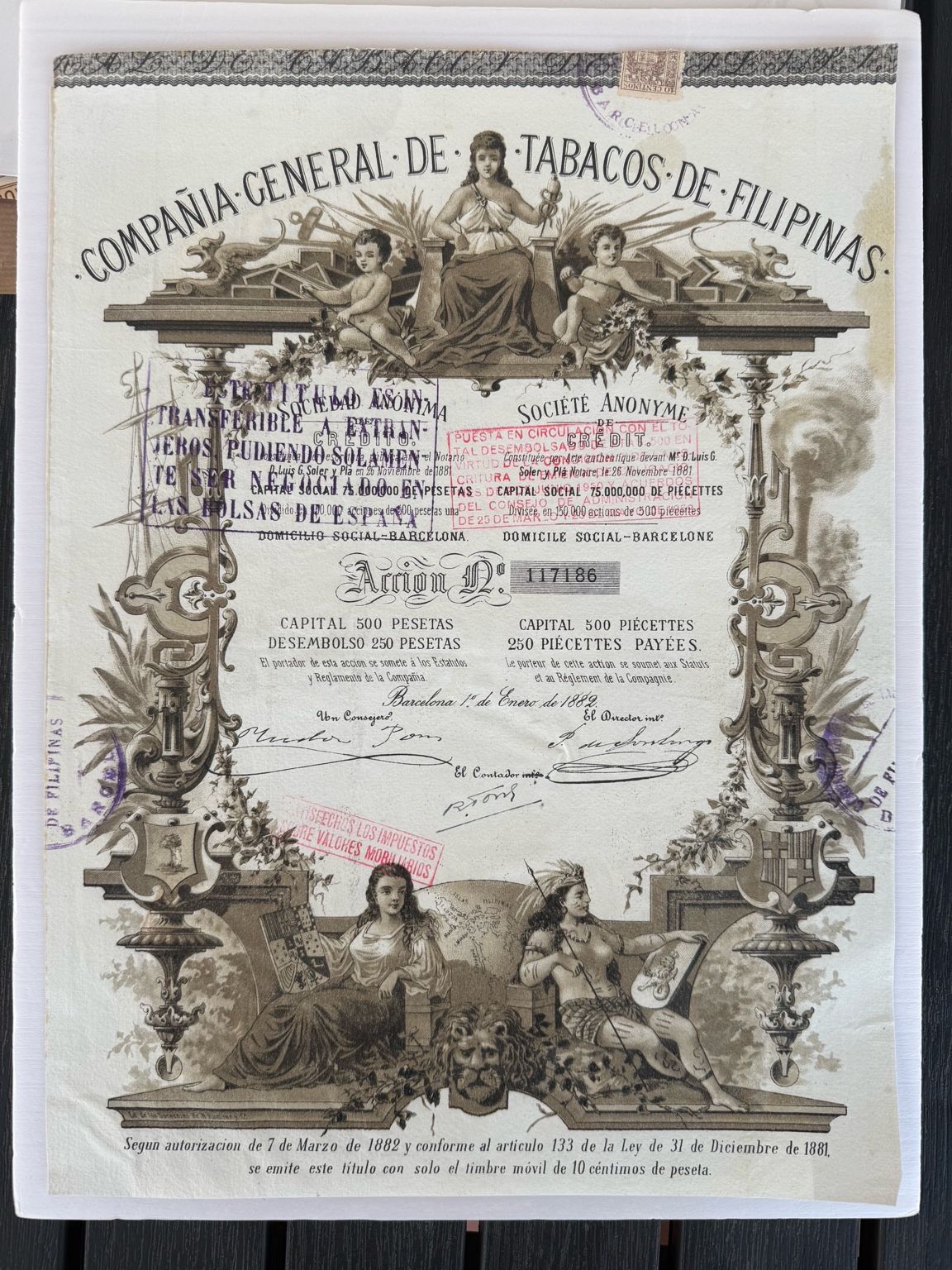 Highly decorative share certificate for the Compañía General de Tabacos de Filipinas, featuring allegorical female figures, tropical landscapes, tobacco plants, and ornate architectural motifs in rich sepia tones. Issued in Barcelona, with bilingual text (Spanish/French), multiple revenue stamps, overprints, and handwritten signatures.