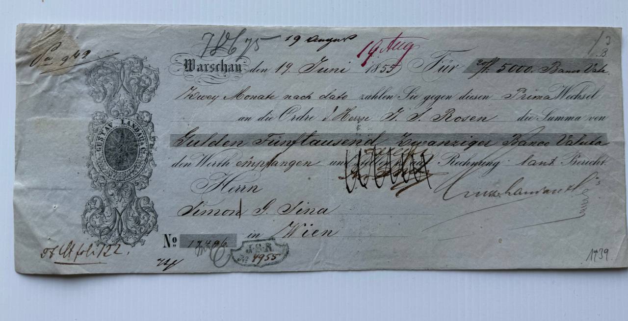 An elaborate promissory note from Warsaw dated June 19, 1854, payable to Simons & Sina in Vienna. Printed and handwritten in Gothic script. Issued by Gustaw Landau. A valuable example of Jewish banking history in the Habsburg/Russian sphere.