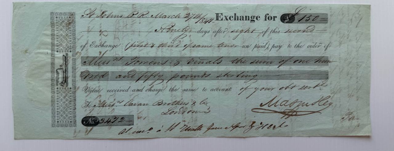 Historic commercial bill of exchange issued on March 27, 1847, from St. John, the English name used historically for San Juan, Puerto Rico. This financial document was drawn in pounds sterling (£150) to be paid in London through Thibaut Larion Brothers & Co. It reflects the international trade and commercial ties between the Caribbean and Europe during the mid-19th century. Signed by “Maguiley”, this rare pre-U.S. annexation Puerto Rican document is an exceptional collectible for those interested in Caribbean economic history and early financial instruments.