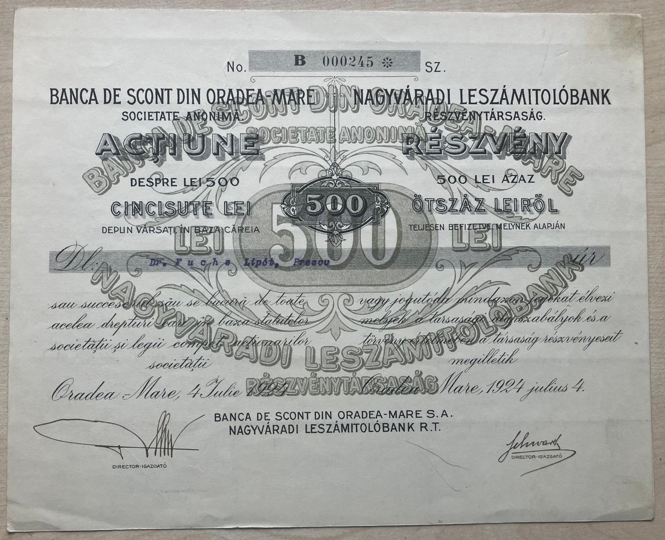 Issued July 4, 1924, by Banca de Scont din Oradea Mare (Nagyváradi Leszámítolóbank) for 500 Lei. Bilingual Romanian-Hungarian certificate reflecting post-Trianon banking in Oradea. An elegant black and gray print with embossed seal and signatures. **Theme:** Transitional banking history between Hungary and Romania.