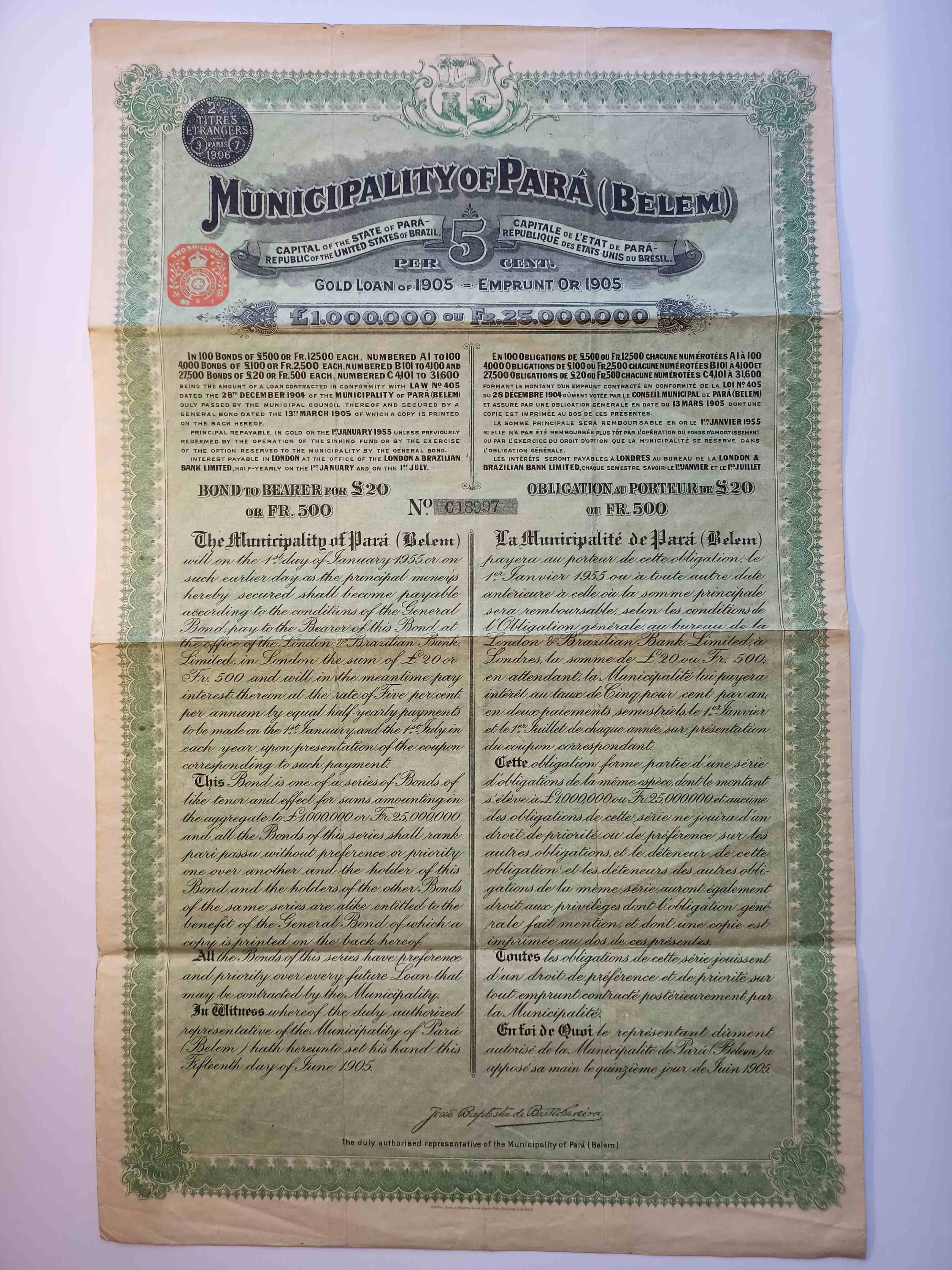 Attractive bond issued by the Municipality of Pará (Belem), Brazil, for the 5% Gold Loan of 1905. Denomination 500 Francs, with green border and bilingual text (English and French). Represents early 20th-century Brazilian municipal foreign debt financing.