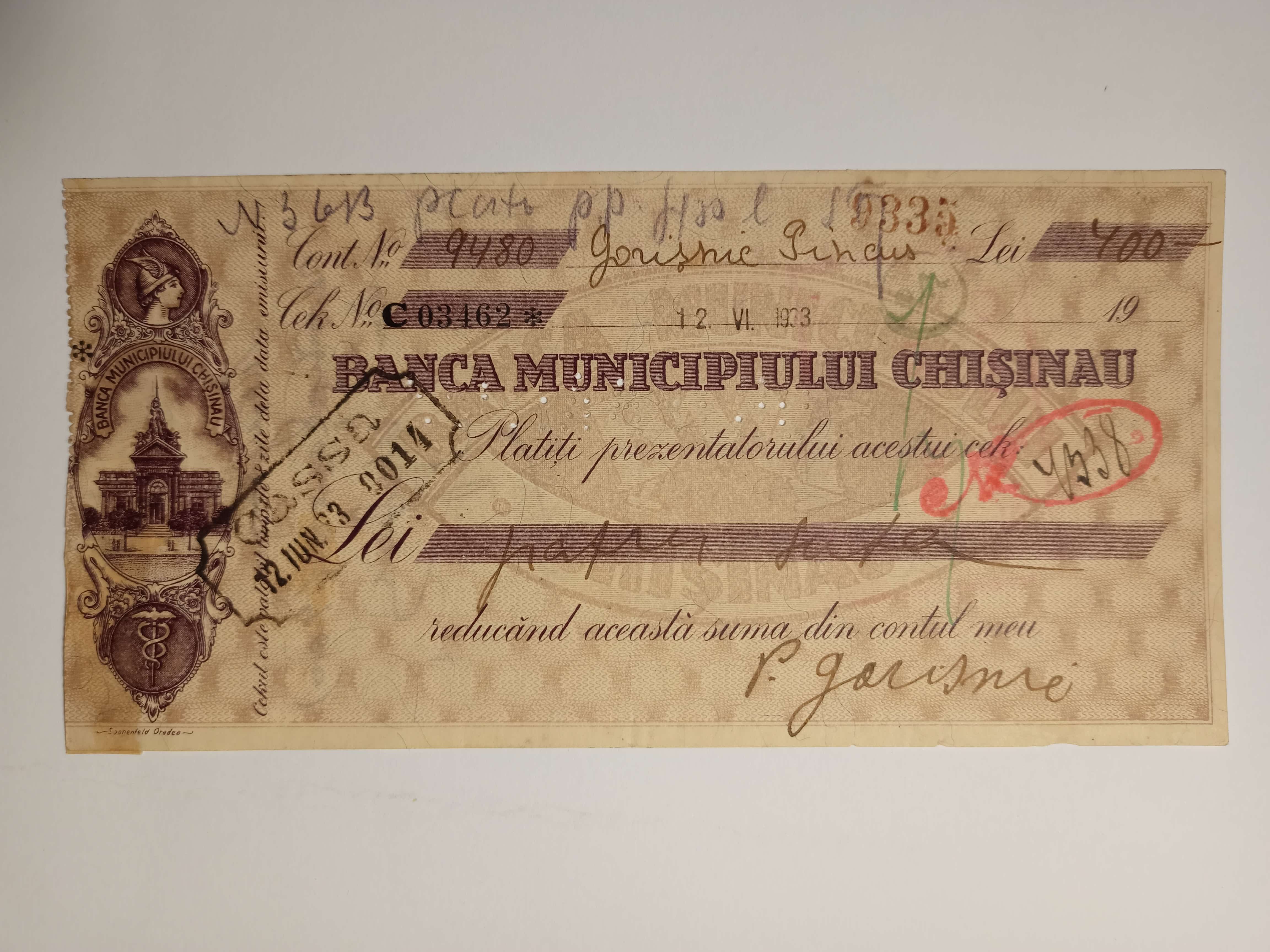 A rare 1933 municipal cheque issued by Banca Municipiului Chisinau in Romania (present-day Moldova). Beautiful ornate design with local emblems, signatures, and cancellation marks. A fantastic piece reflecting regional banking history during the interwar period.