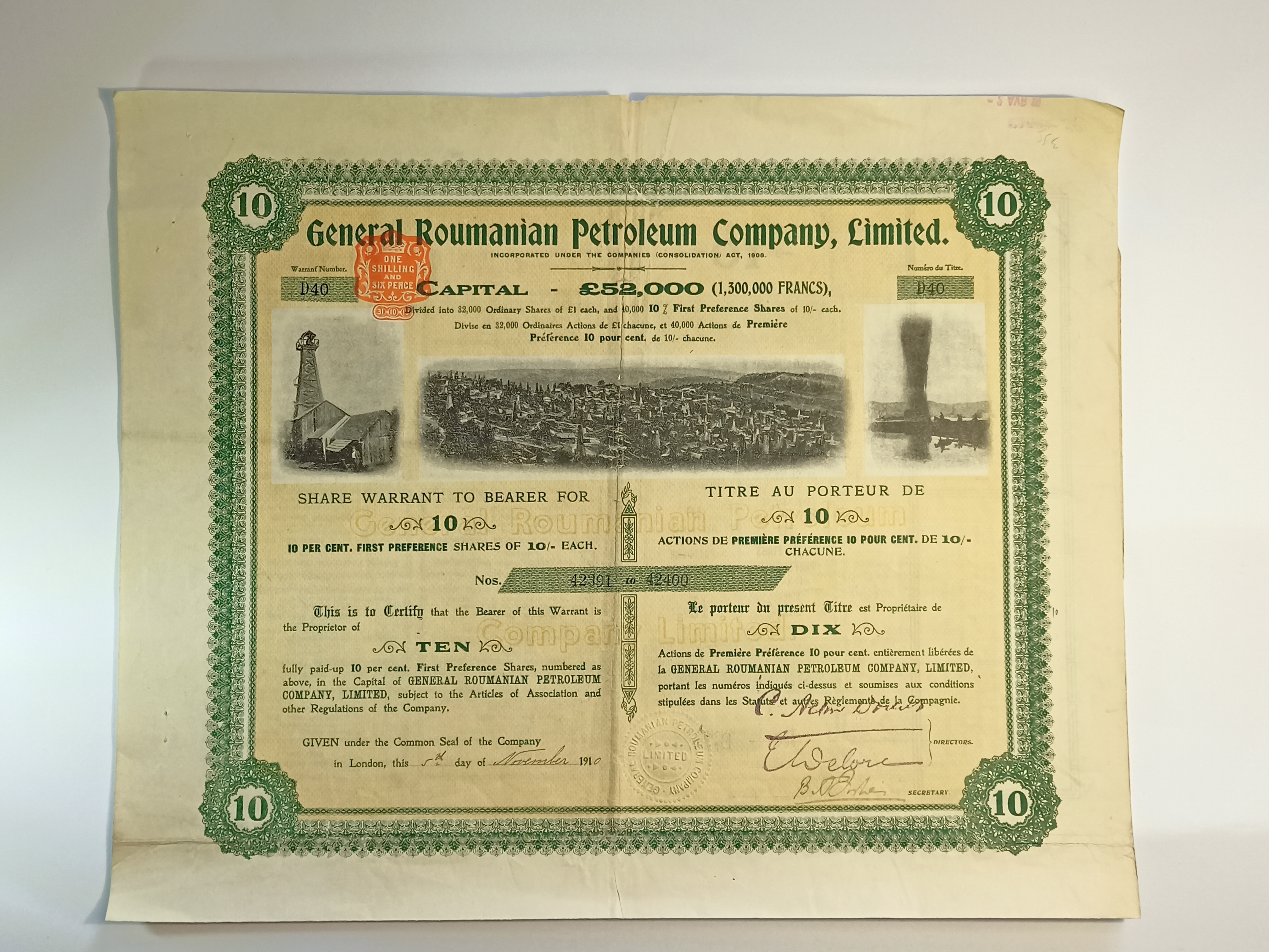 Rare oil-related bearer share warrant from the General Roumanian Petroleum Company Ltd., issued in London in 1910. Includes oilfield vignette. Capital of £58,000 split into preference shares. Early British investment in Romanian oil sector.
