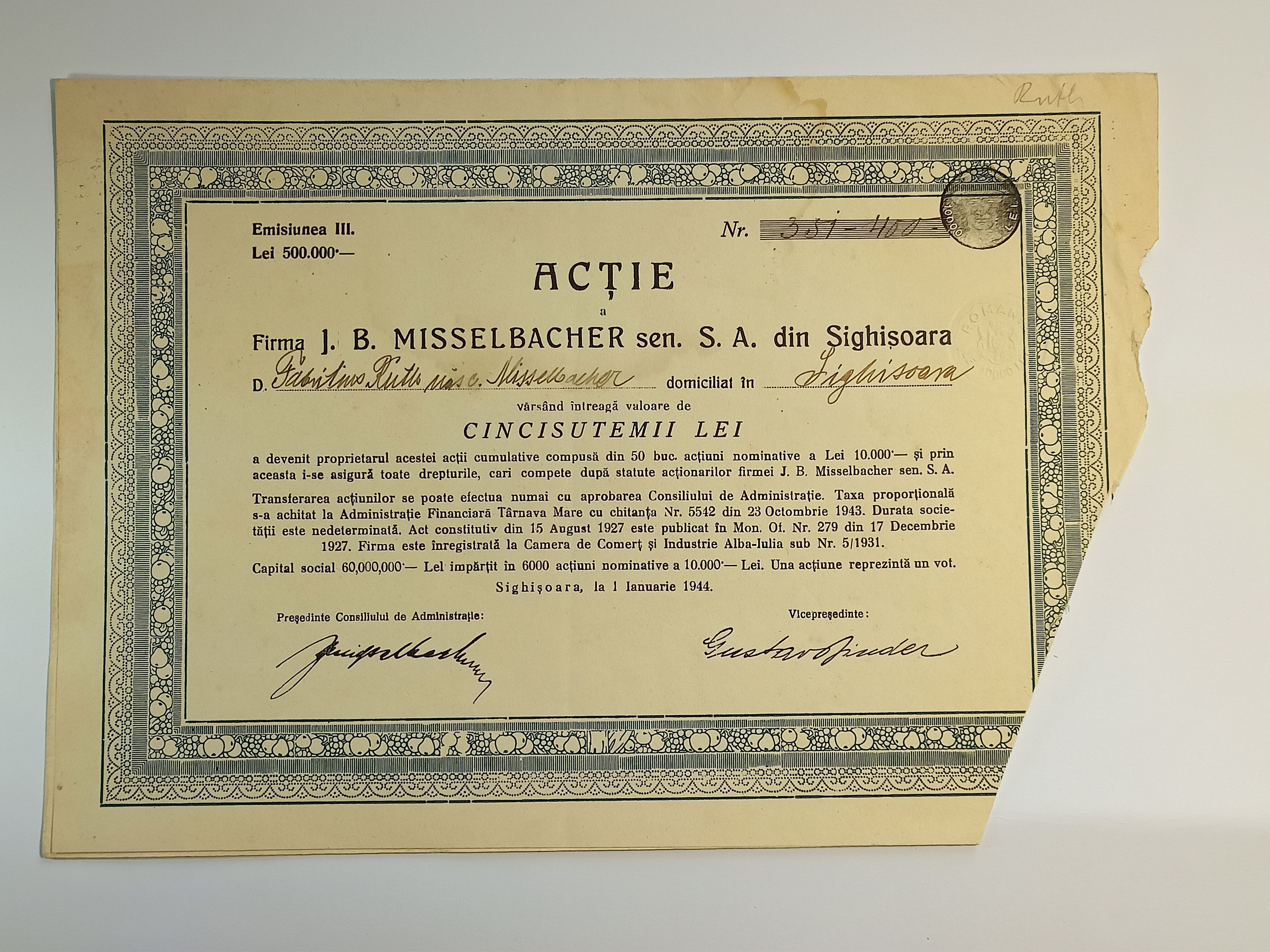 Romania, J. B. Misselbacher sen. SA, nominative share certificate, Sighisoara, 1944, 500,000 Lei