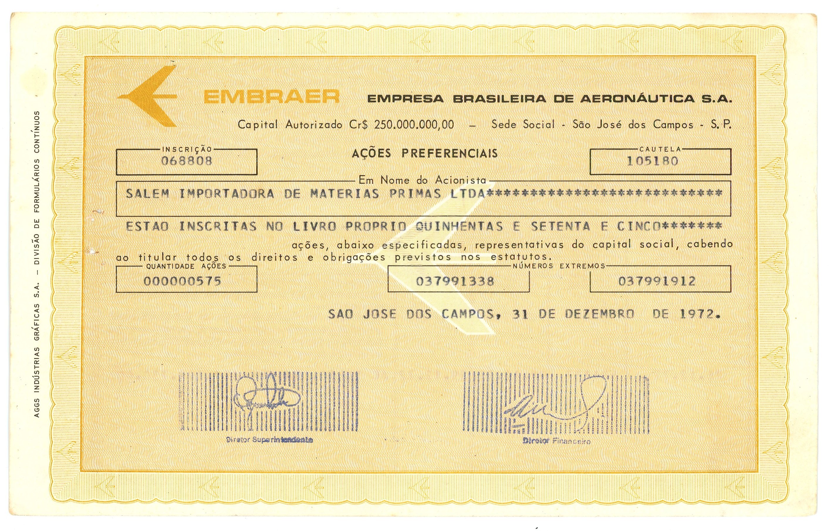 Brazil Embraer Embresa Brasileira de Aeronautica SA Preferred Shares 1972