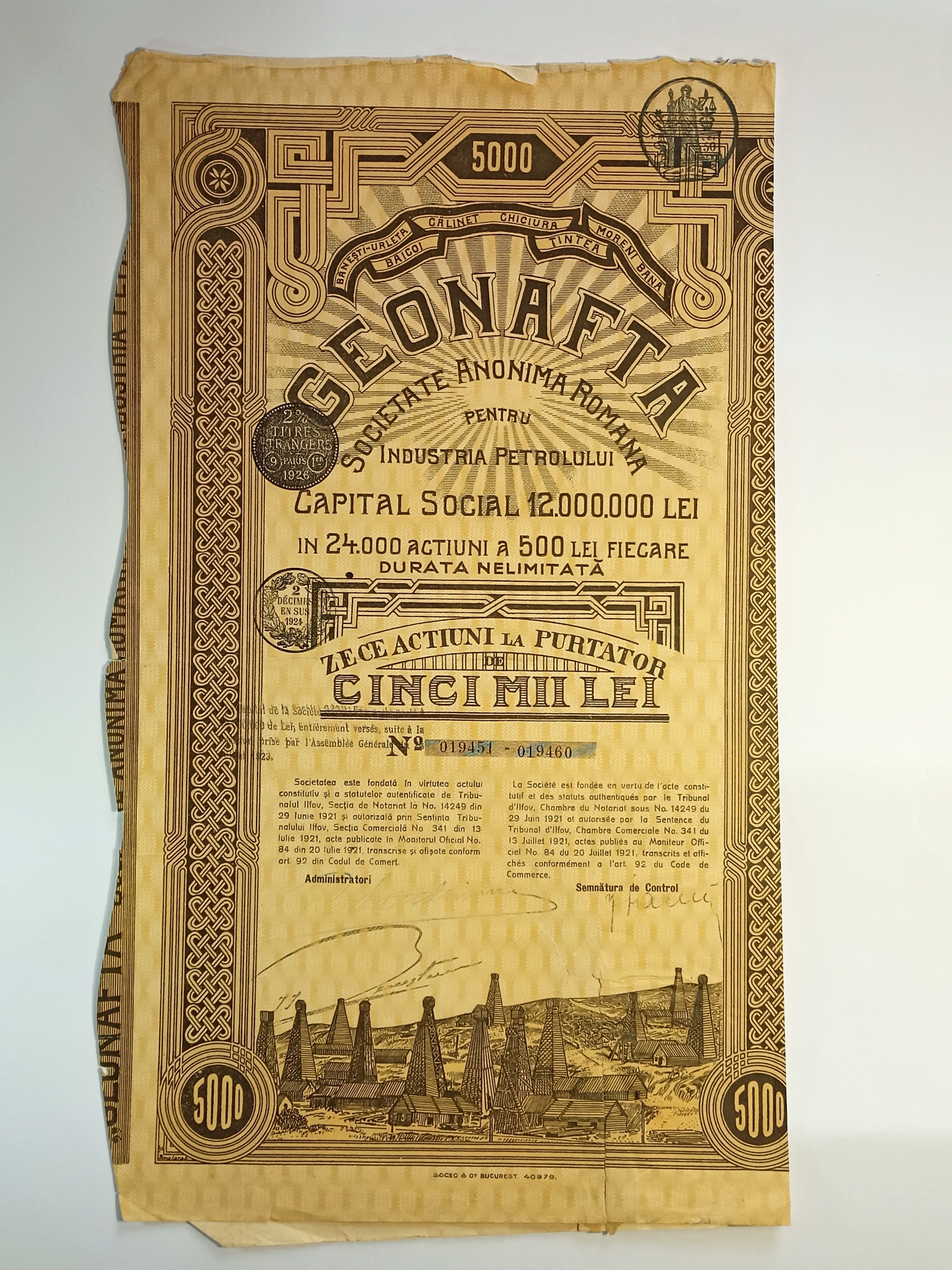 Impressive and rare 10-share certificate (10×500 Lei = 5000 Lei) from Geonafta SA, dated 1923. Grand oil-themed imagery and decorative fonts. Romanian oil scripophily centerpiece.