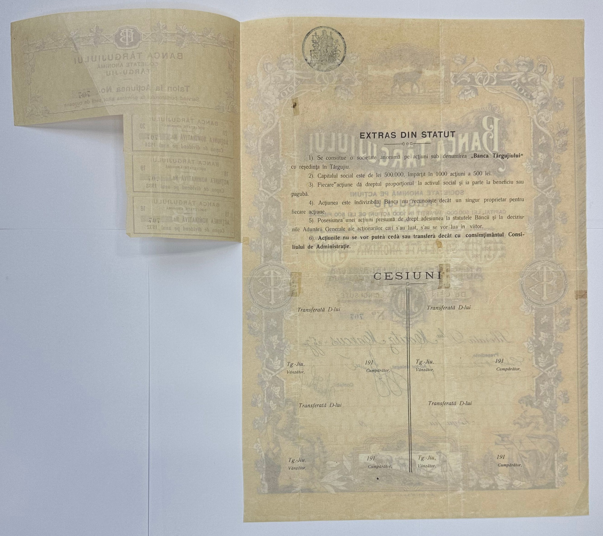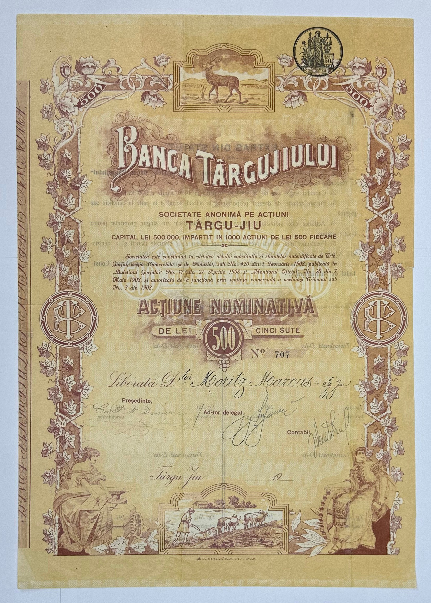 Târgu-Jiu; Pretty border of vines and flowers, with vignettes of a deer, ploughing with oxen, and two elegant ladies (one in traditional dress) with symbols of industry. VF