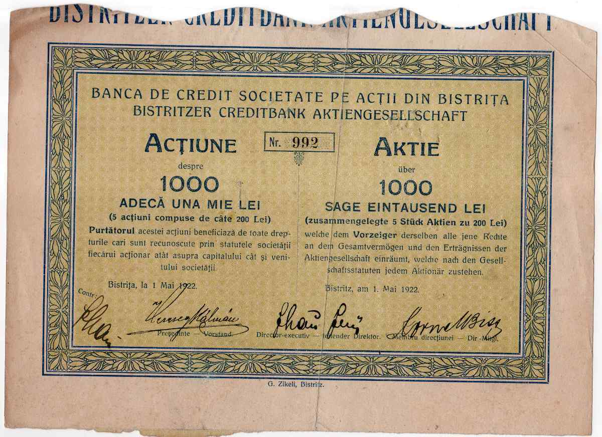This bilingual Romanian-German share certificate from Bistritzer Creditbank (Banca de Credit Societate pe Acțiuni), issued in 1922, showcases the financial operations of Transylvania during its post-Austro-Hungarian transition to Romania. A rare dual-language artifact with strong historical and regional resonance.