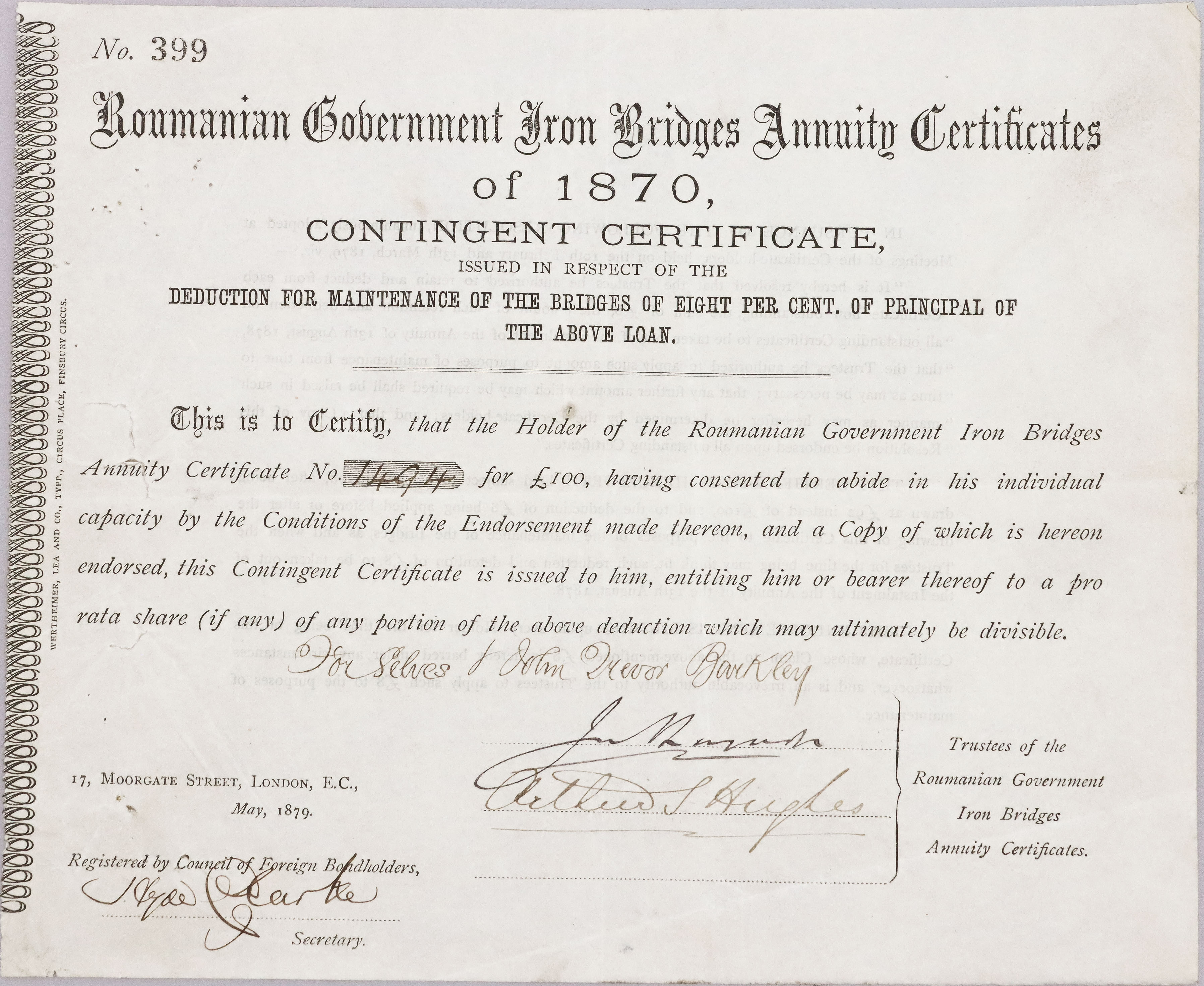 Contingent Certificate issued in respect of the deduction for maintenance of the bridges of eight per cent of principal of the Roumanian Government Iron Bridges Annuity of 1870, black, white, folds, small pin holes, tears, original signatures.