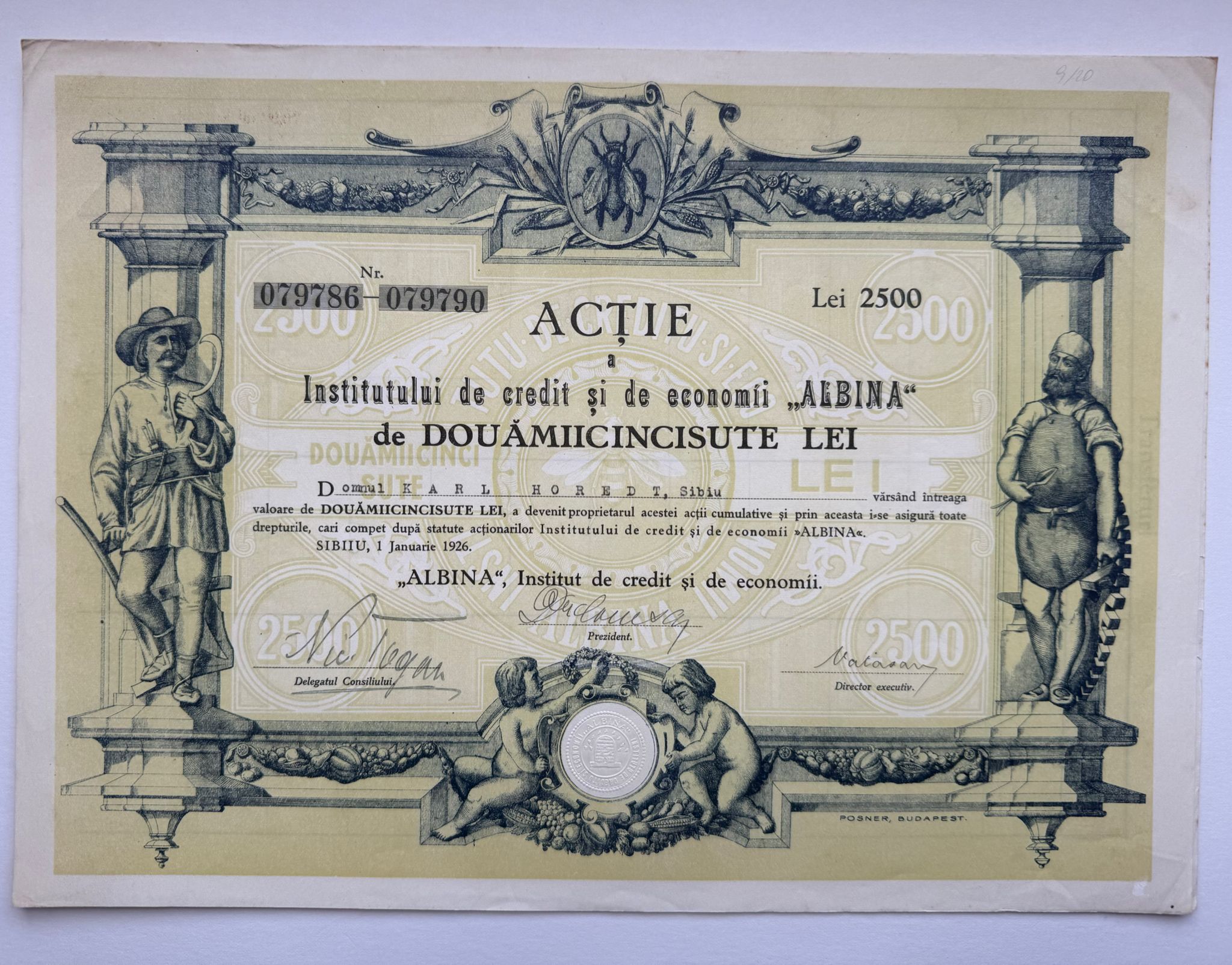 Share certificate from the Albina Institute of Credit and Savings, Sibiu, dated January 1, 1926, for 2500 Lei. Printed by Posner, Budapest, with vivid design of worker and peasant statues and bee emblem. An emblematic piece of Transylvanian cooperative banking in the interwar period, representing financial independence and rural development.