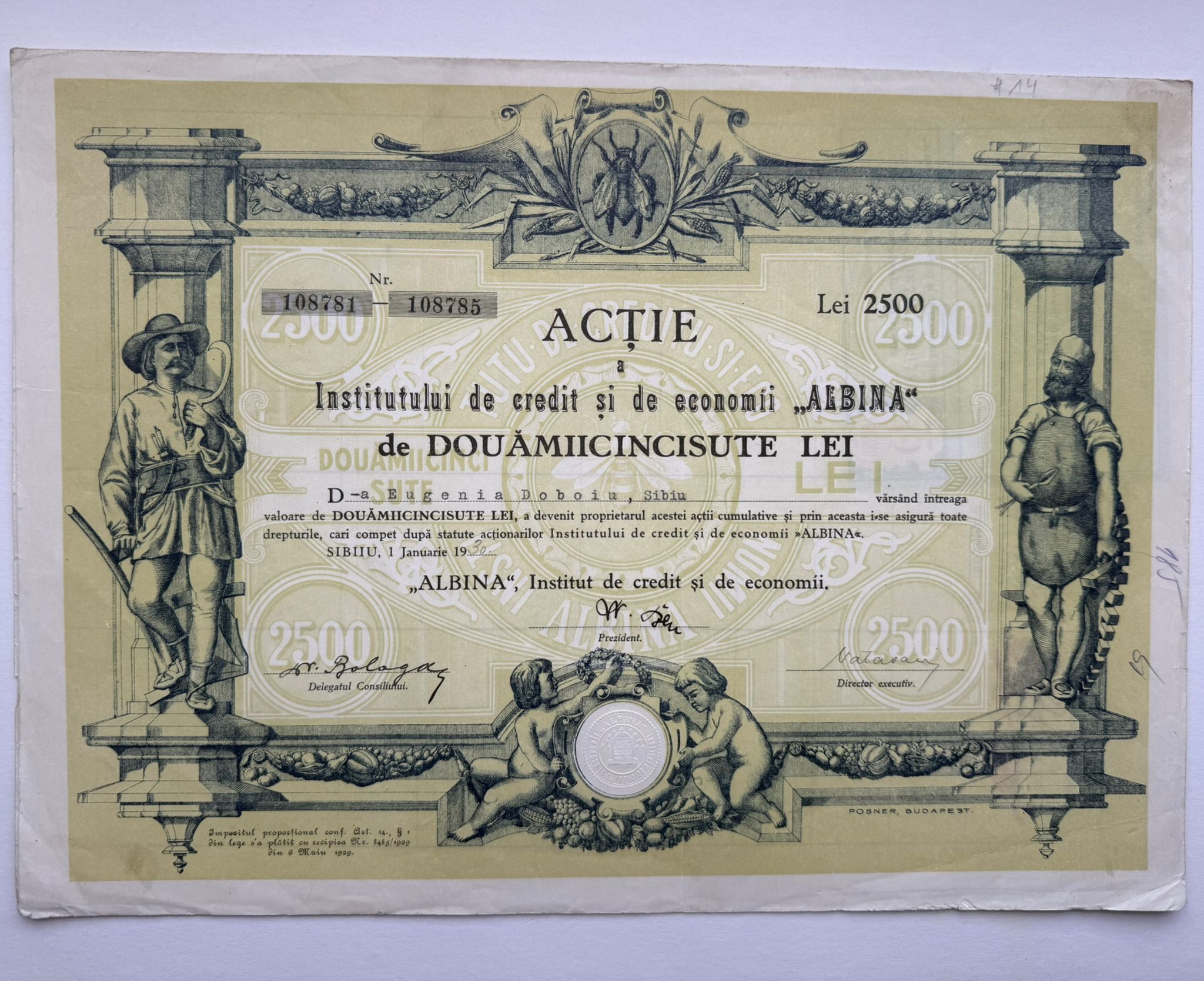 Another variant of the Albina 2500 Lei share, dated January 1, 1926, from Sibiu. Decorated with Romanian motifs, allegorical worker and farmer figures, and embossed company seal. Highly collectible example from the same emission, symbolic of national progress in Romanian banking.