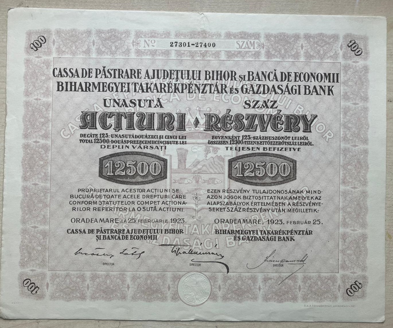 Share certificate of Cassa de Păstrare a Județului Bihor și Bancă de Economii (Biharmegyei Savings and Economic Bank), Oradea, February 25, 1923, for 12,500 Lei. Printed in dual Romanian-Hungarian text with elegant border and embossed seal. Represents postwar regional finance rebuilding efforts in Bihor County. **Theme:** Early Romanian local banking after 1918.
