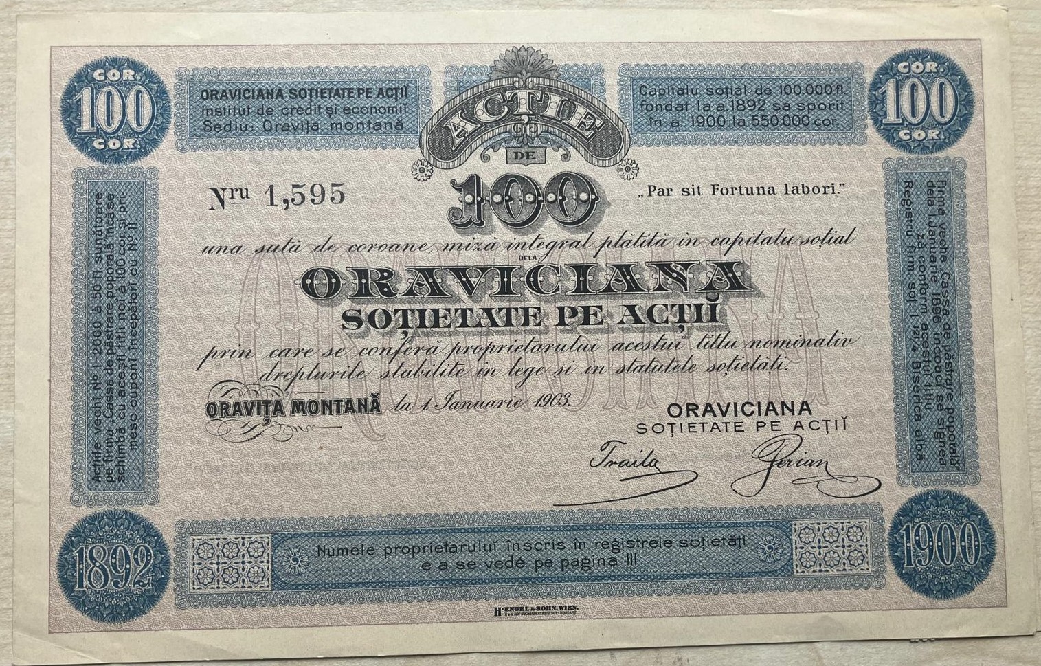 A decorative share from the Oraviciana Societate pe Actii, an early credit and savings institution based in Oravița Montană. Issued for 100 Coroane, this 1903 certificate has elegant blue printing and a prominent ‘1892’ founding date motif. Rare piece from one of Banat’s earliest cooperative banks.