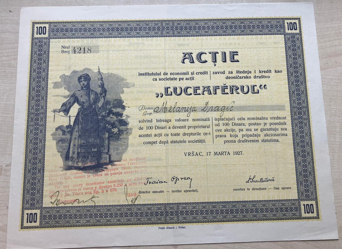 Share issued in 1927 by the Institutul de Economii si Credit ‘Luceafărul’ (Morning Star) in Vršac. Beautiful yellow-toned design featuring a traditional female figure spinning thread. Printed in both Romanian and Serbian. Represents the post-WWI economic integration of Banat under Yugoslav administration.