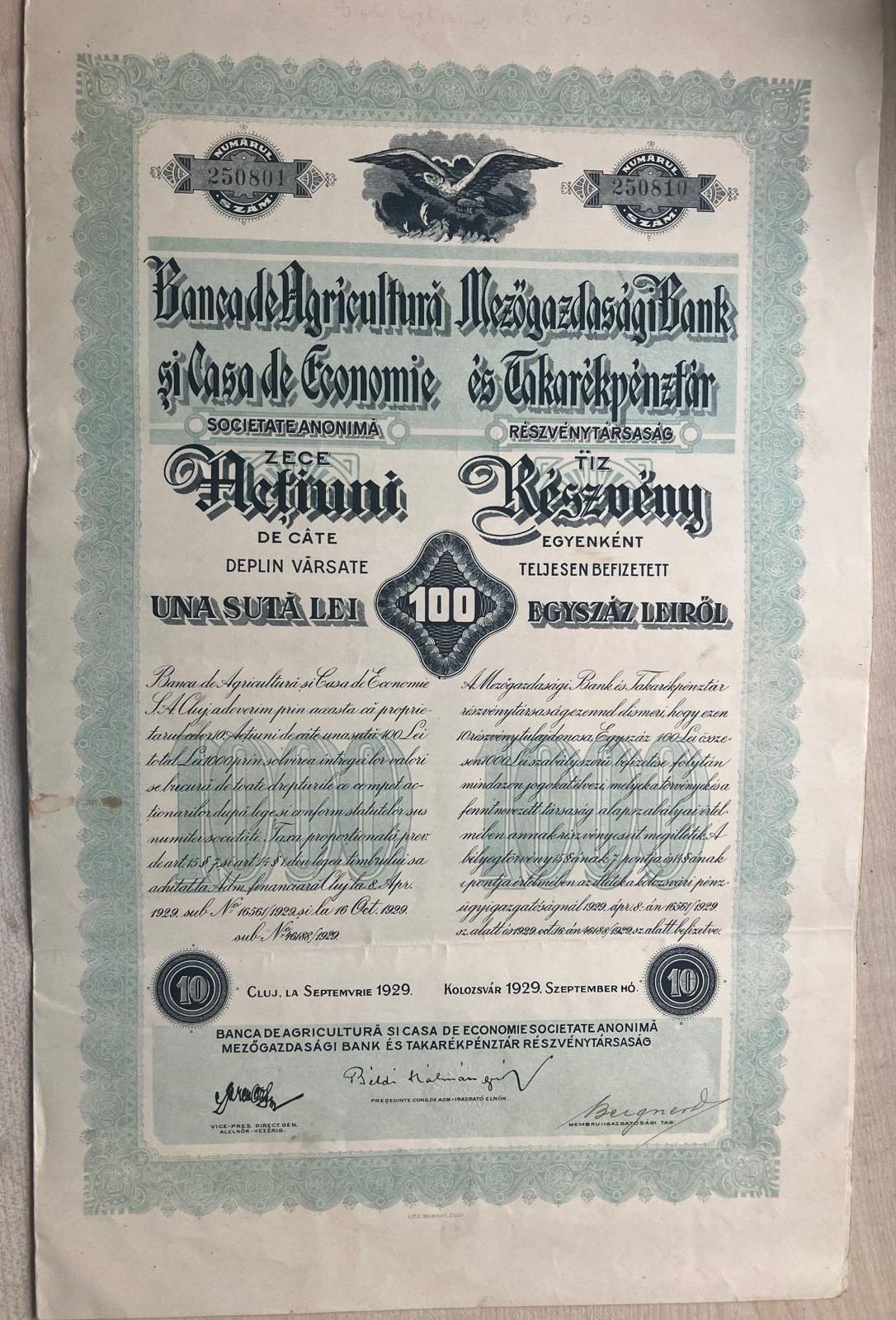 Issued in 1929, this certificate from Banca de Agricultură și Casa de Economie of Cluj (Kolozsvár) represents ten shares of 100 Lei each. Impressive bilingual layout with green ornamental border and a vignette of an eagle symbolizing prosperity. Prominent interwar agricultural bank of Transylvania.