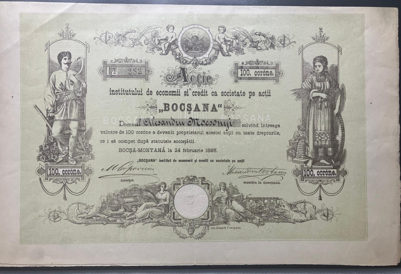 Beautiful early share from the Institutul de Economii și Credit „Bocșana” in Bocșa Montană, issued for 100 Coroane in 1895. Features detailed allegorical engravings of male and female peasants symbolizing rural prosperity, with ornate green printing and embossed seal. A fine example of late 19th-century Banat regional finance and cooperative movement.