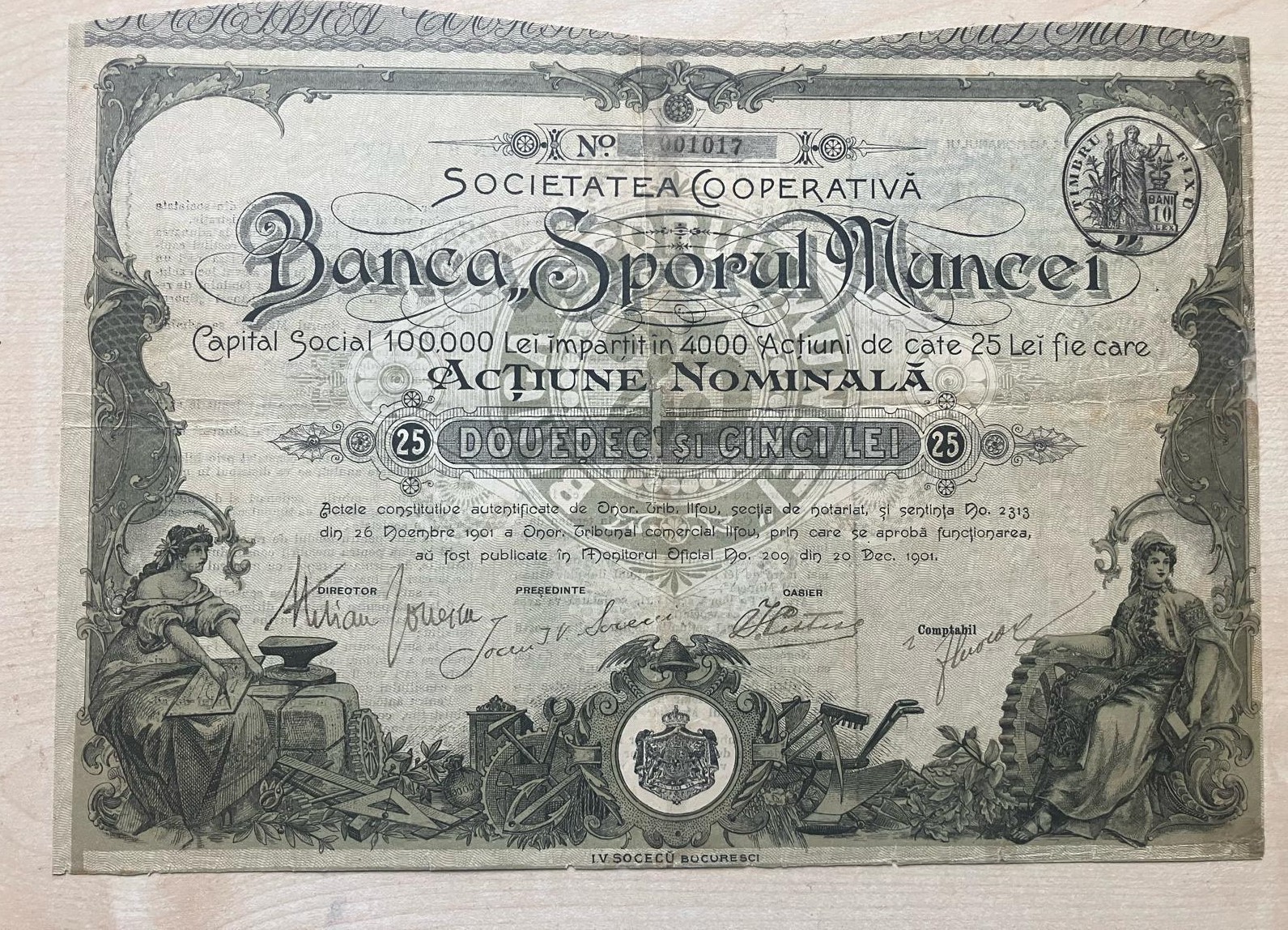 Decorative share from the cooperative Banca „Sporul Muncii” of Ilfov, issued in 1901 for 25 Lei. Features allegorical female figures of Industry and Agriculture surrounded by tools and mechanical elements. Richly detailed early Romanian cooperative certificate, printed by I.V. Socec, Bucharest.