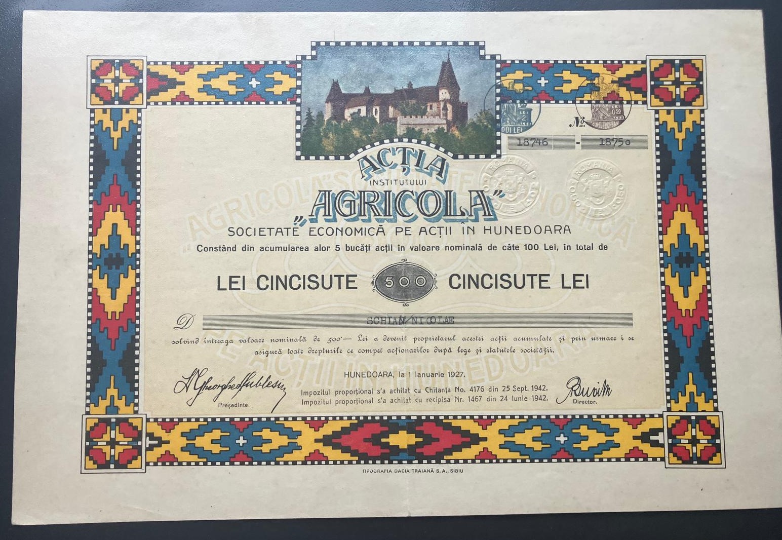 Vivid and colorful share from the Institutul Agricol „Agricola” of Hunedoara, issued in 1927 for 500 Lei. Features Romanian folk border motifs and an image of Corvin Castle. Exceptional Art Deco period design symbolizing the agricultural identity of Transylvania. Printed by Dacia Traiana, Sibiu.