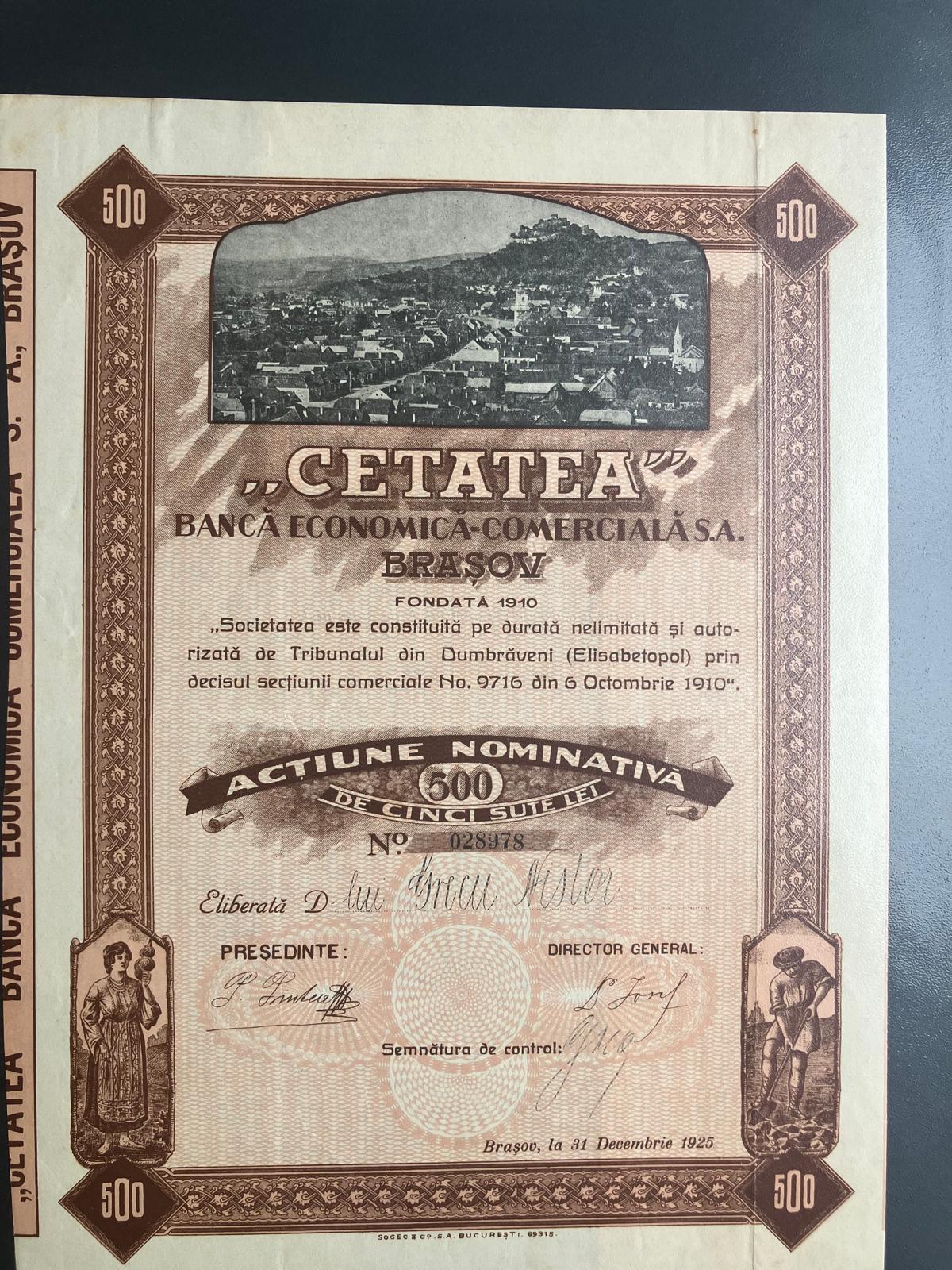 Beautiful Art Deco-era share from Banca Economică-Comercială „Cetatea” of Brașov, issued for 500 Lei in 1925. Features a view of Brașov city and vignettes of Romanian workers in traditional attire. The bank served the Transylvanian region’s urban and agricultural economies. Printed by Socec, Bucharest.