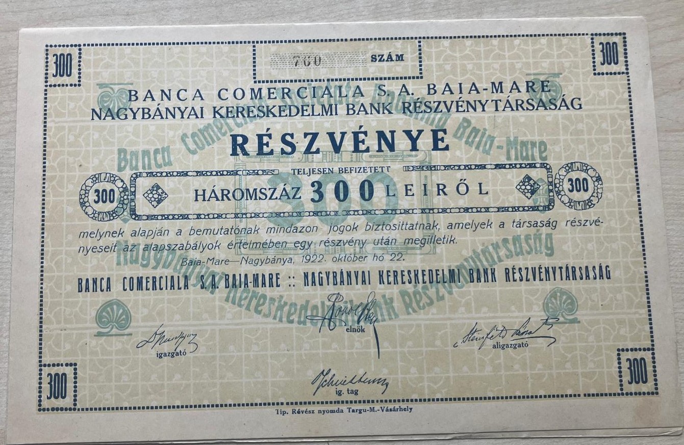 Bilingual Romanian–Hungarian share certificate from the Banca Comercială S.A. Baia-Mare (Nagybányai Kereskedelmi Bank Rt.), issued in 1922 for 300 Lei. Printed by Révész Nyomda, Târgu Mureș. Represents the bilingual commercial culture of interwar Transylvania. A desirable regional banking piece.