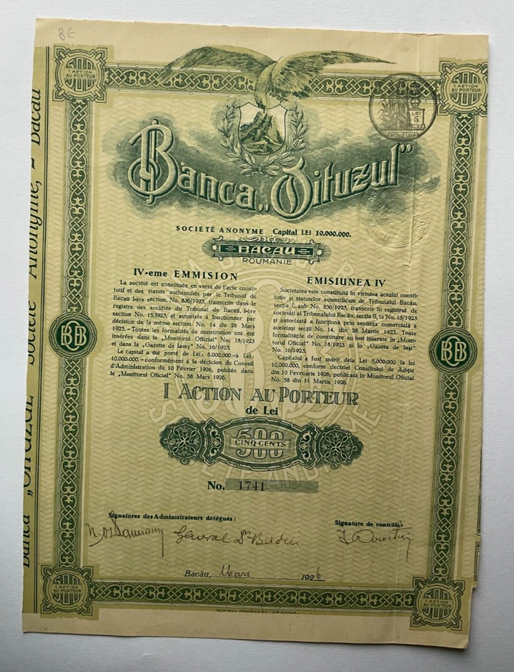 Romania Banca Oituzul Bacau Moldova 1923 Share 500 Lei