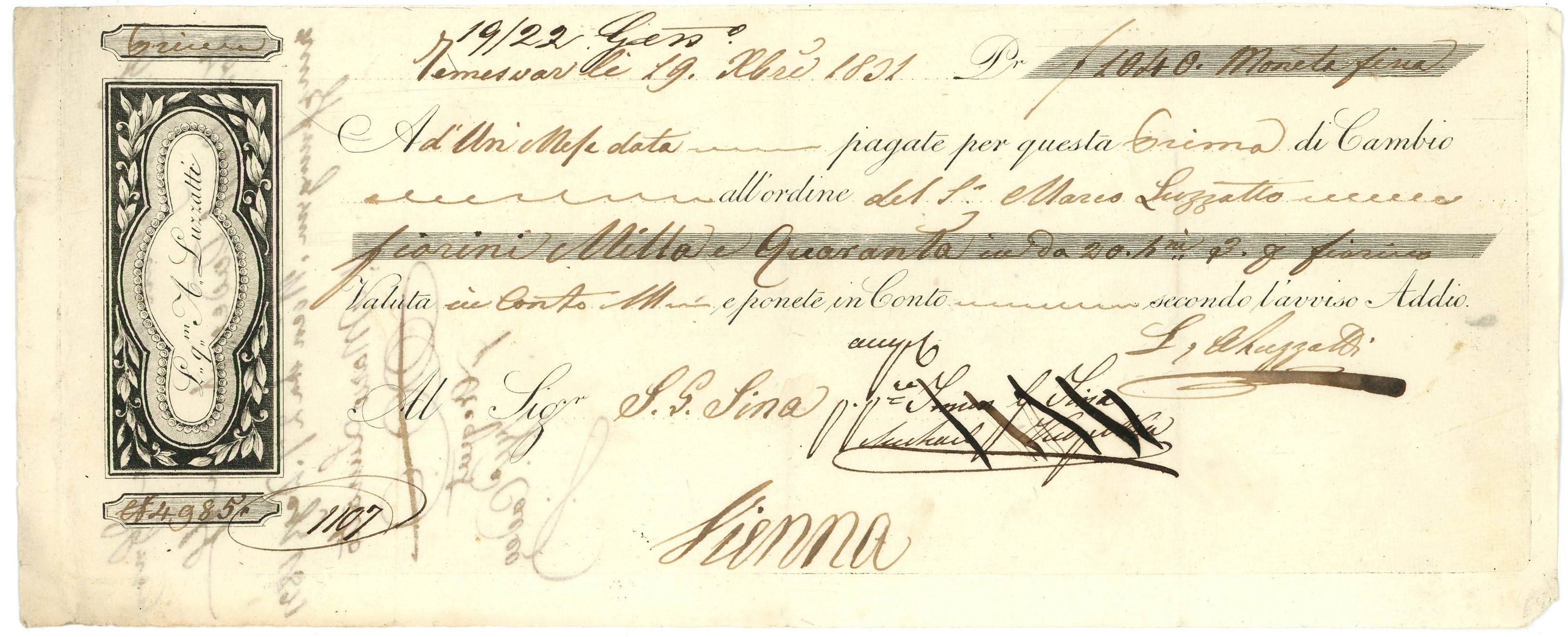 Hungary Romania A. Luzzatto Temesvar (Timisoara) Bill of Exchange for 1040 Florins 1831