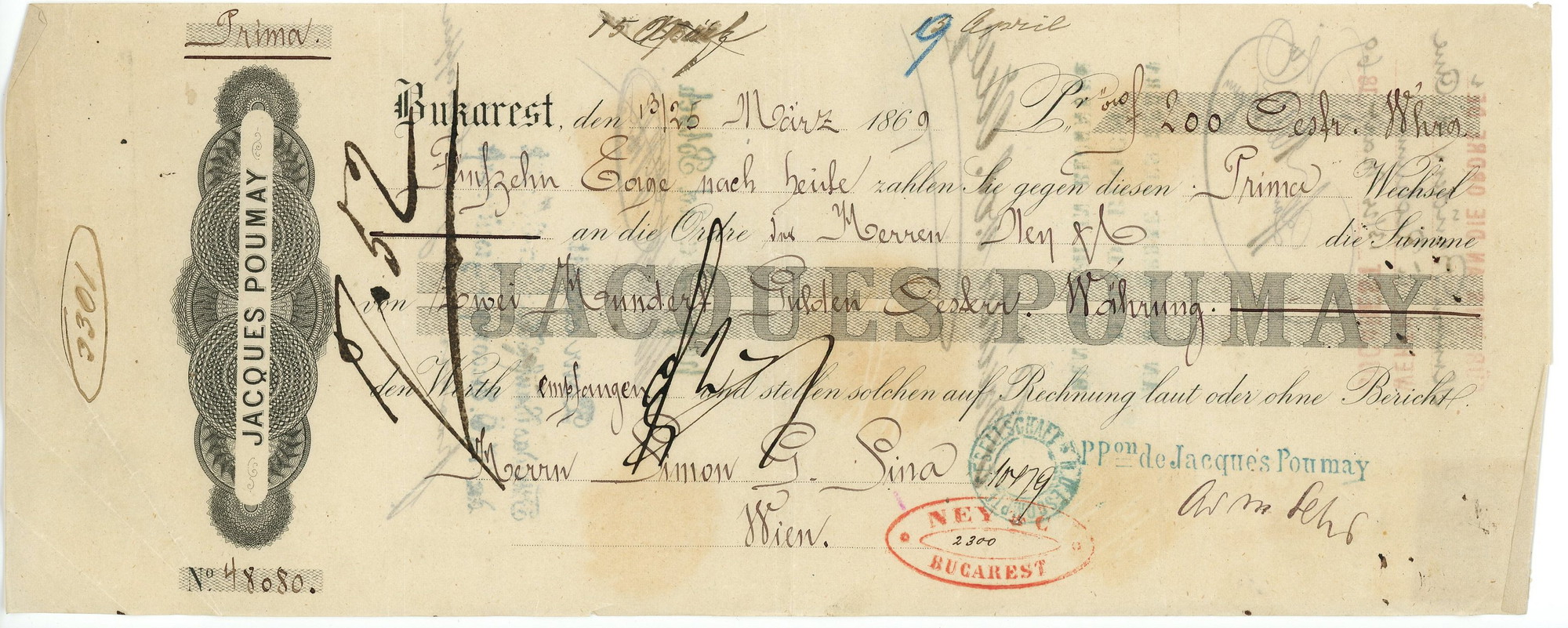 Romania Jacques Poumay Bill of Exchange for 200 Gulden 1869