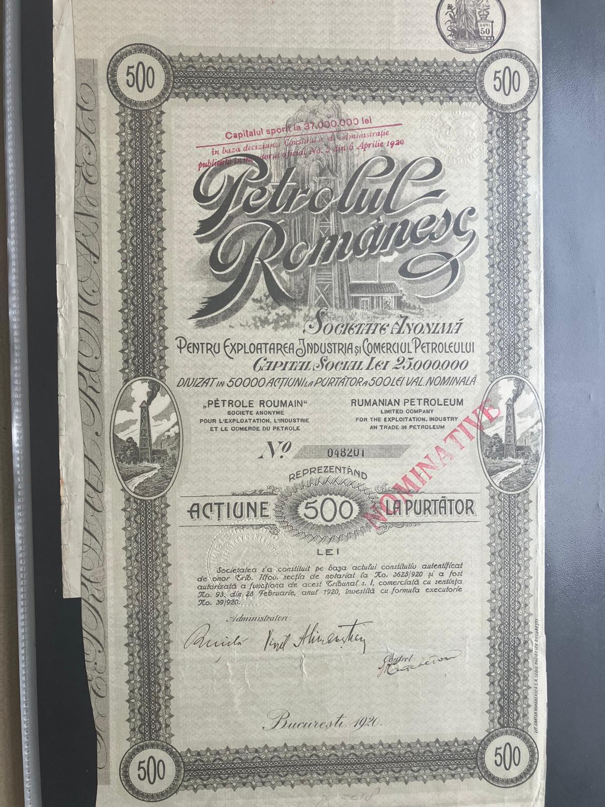 Historic oil industry share from Petrolul Românesc S.A., issued in 1920 for 500 Lei. Engraved in black and grey with oil wells and industrial motifs. The company was active in petroleum extraction and export during Romania’s oil boom years. Signed by early Romanian petroleum pioneers.