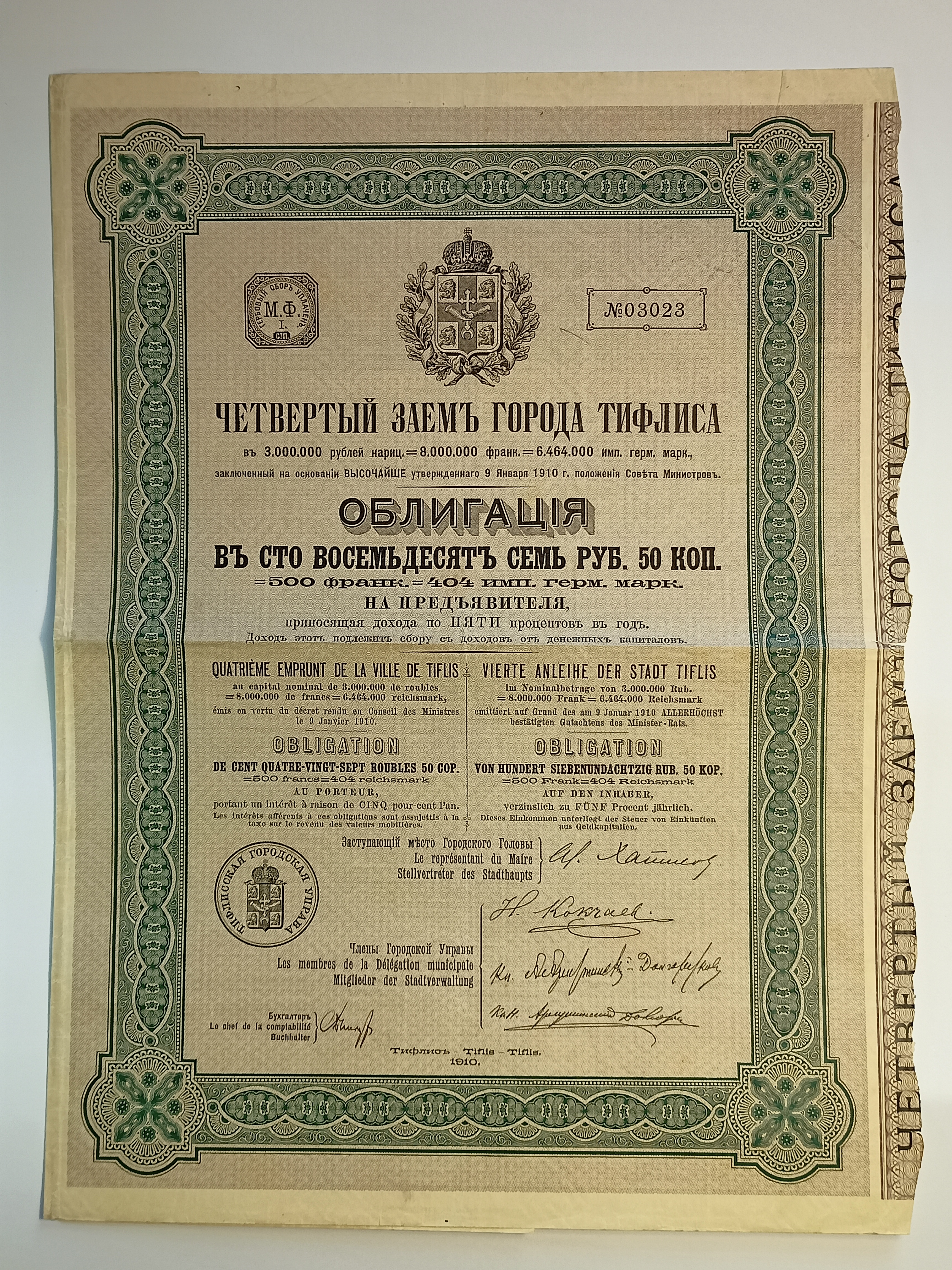 Attractive multilingual (Russian, French, German) bond certificate for the Fourth Loan of the City of Tiflis (now Tbilisi), issued in 1910. Printed in green, ornate frame with imperial arms. Denomination 187.50 Roubles. Represents municipal finance in the Russian Empire.
