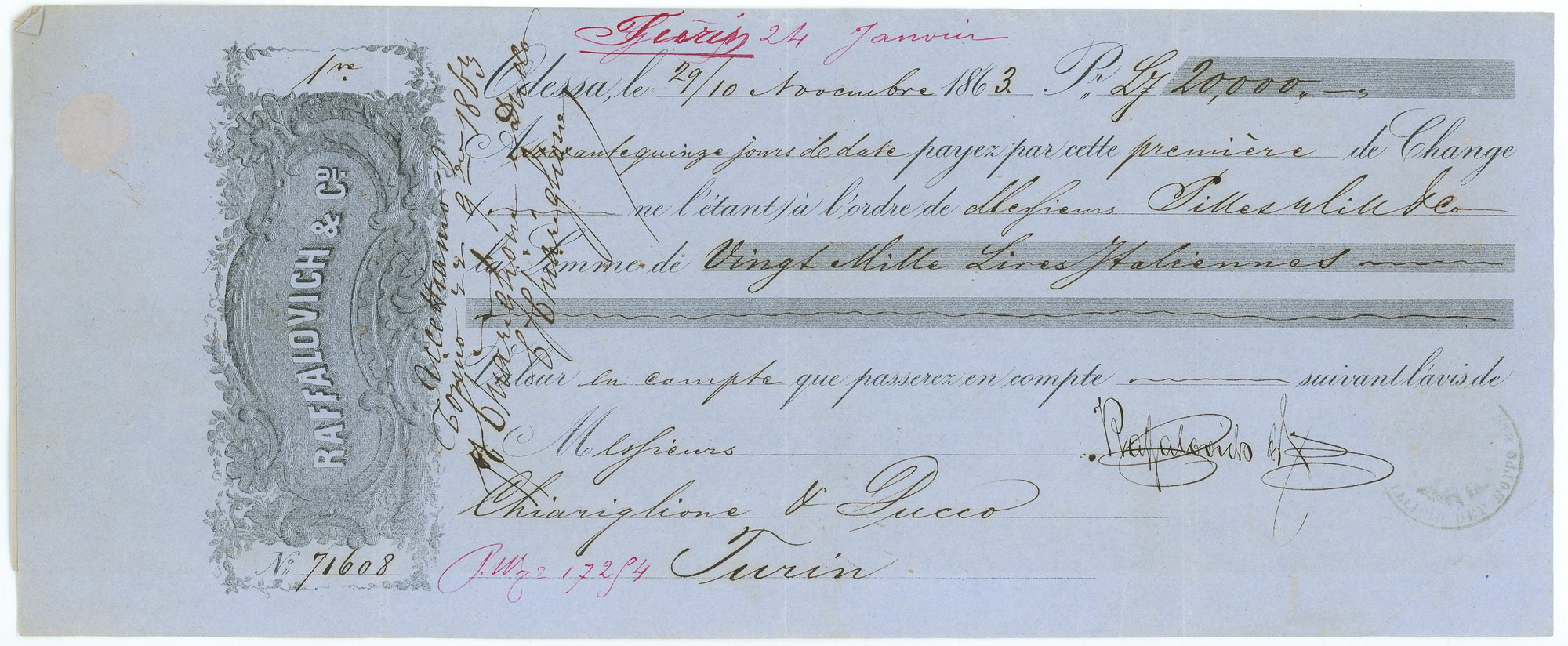 # 71608 Raffalovich & Co. was founded in Odessa in 1833. It was one of the biggest private bank in Russian Empire. Hand=signed by the founder Hermann Raffalovich. Scarce and uncommon XF+