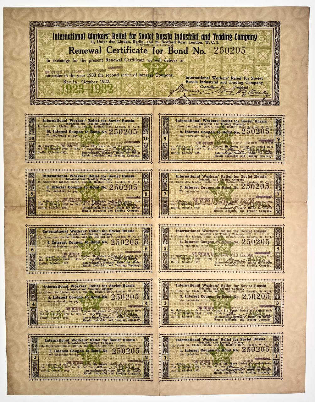 Rare and historically important Renewal Certificate for Bond No. 250205, issued in October 1922 by the International Workers’ Relief for Soviet Russia Industrial and Trading Company. Printed in Berlin and listing offices in London, this document represents early international socialist financial solidarity with the newly formed Soviet Russia.