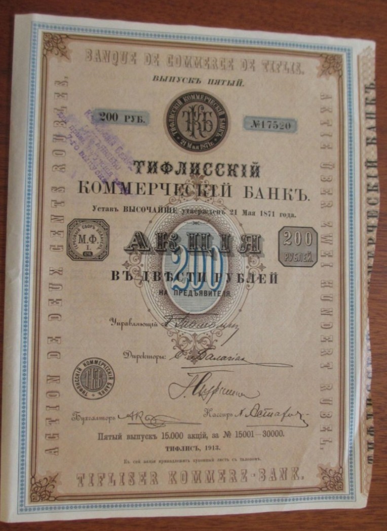 Issued in Tiflis (now Tbilisi) in 1914 by Banque de Commerce de Tiflis for 200 roubles. Printed in Russian, French, and German, showing the cosmopolitan nature of the Caucasian economy. Highly detailed multicolor design with embossed seal and decorative script. Important relic of the financial system of the Russian Empire in the South Caucasus.