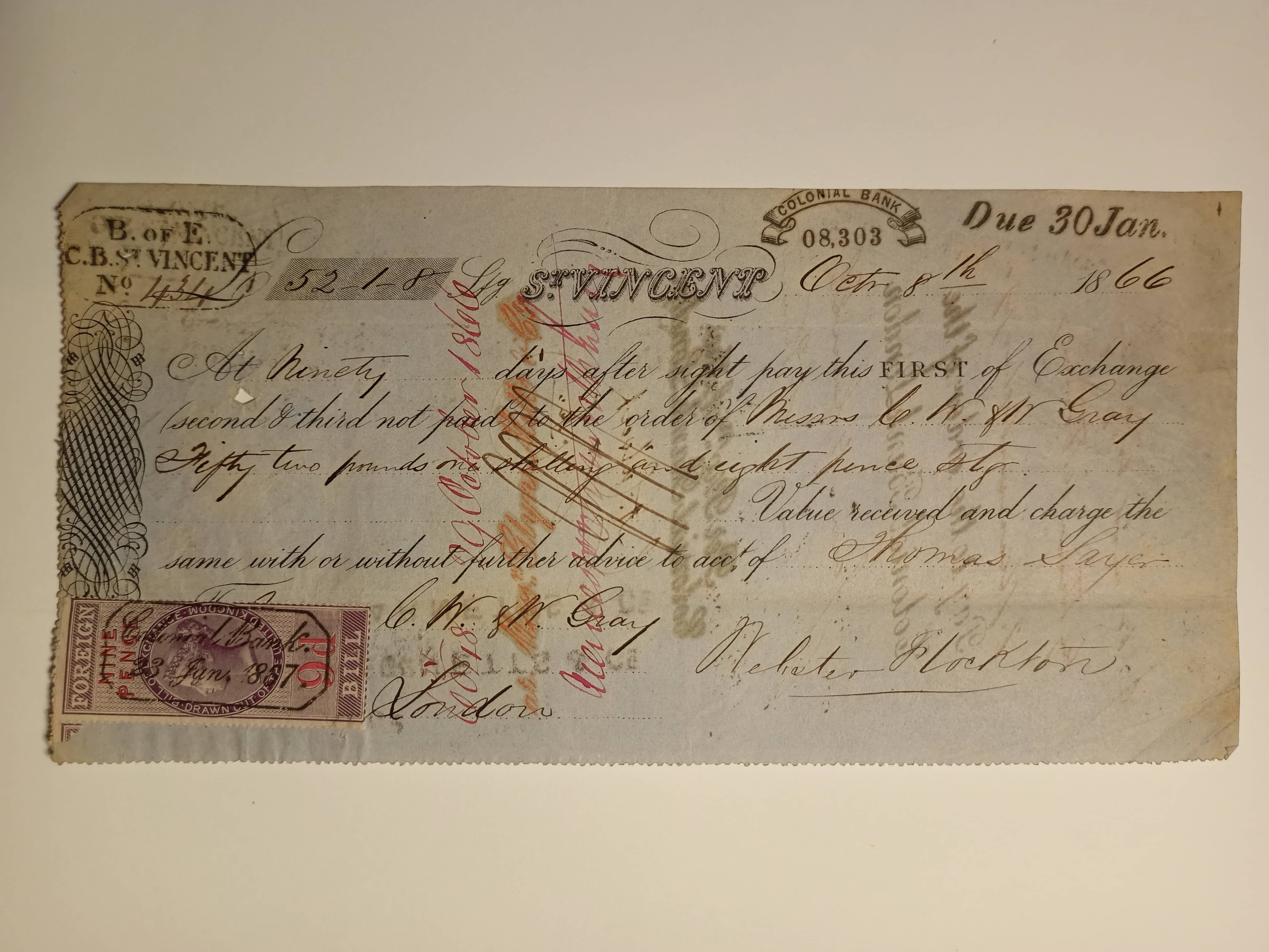 Bill of exchange issued by the Colonial Bank, St. Vincent (British West Indies) in 1866, payable in London. Features purple 1 shilling revenue stamp and intricate pen annotations. Scarce Caribbean colonial banking document.