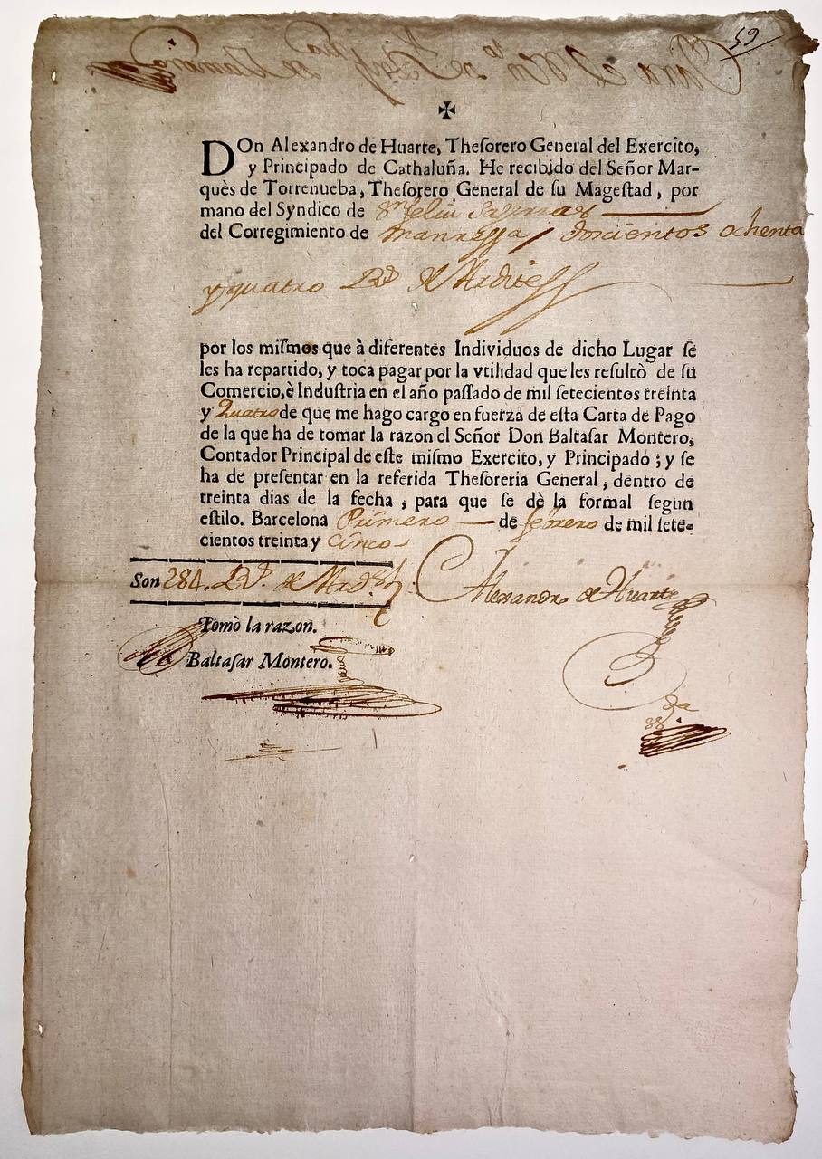 # 39 Signed by Don Alexandro de Hoartes, the Treasurer of the Army, as receipt for the payment received from Marques de Torrenueva, the Royal Treasurer. Interested document of Spanish history.