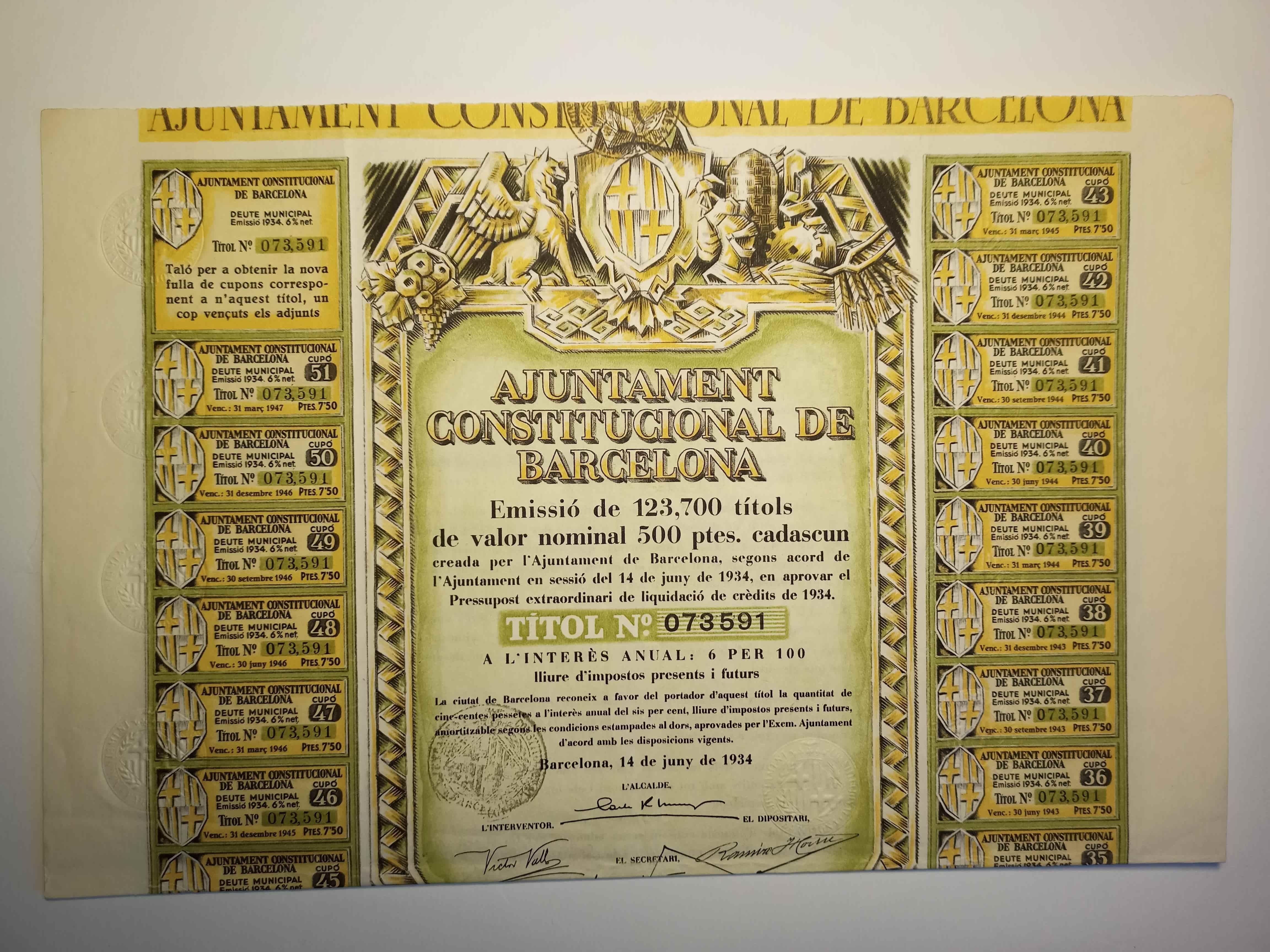 Colorful and highly detailed municipal bond issued by the Constitutional Council of Barcelona in 1934, valued at 500 pesetas. Issued during the Second Spanish Republic, with full coupon sheet. A stunning piece of political and economic history from pre-Civil War Spain.