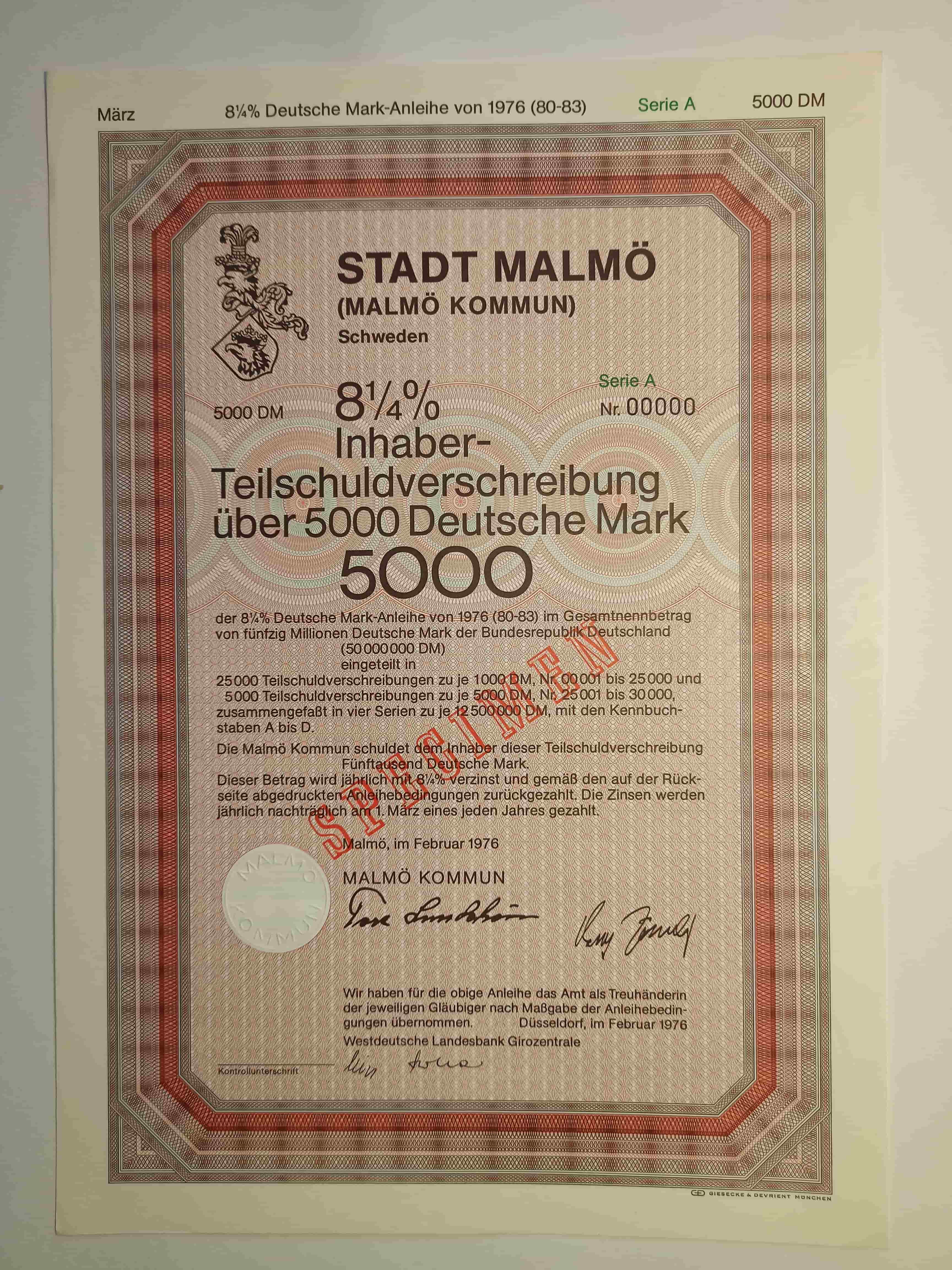 Scarce municipal bond issued by the City of Malmö in 1976, denominated in 5000 Deutsche Marks with 8¼% interest. This reflects Sweden’s borrowing in foreign currency during the 1970s. Large format, crisp design, with Malmö’s coat of arms. Historically important European municipal finance collectible.