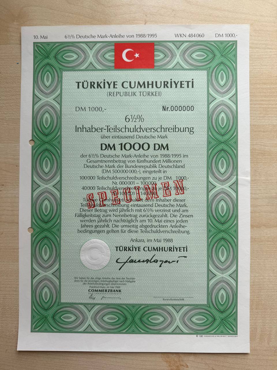 Specimen of the 6.5% Deutsche Mark Bond issued by the Republic of Turkey in 1988, through Commerzbank. A historic financial document illustrating international debt relations between Turkey and Germany in the late 20th century.
