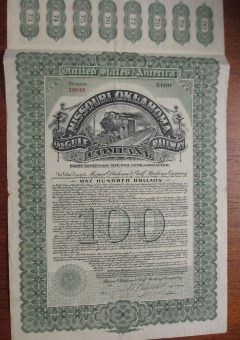 Missouri, Oklahoma and Gulf Railway Co $100 Mortgage 5% Gold Bond 1924
