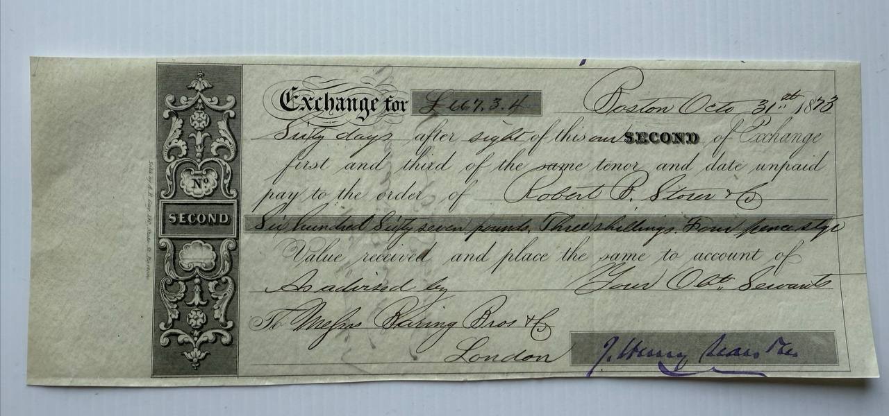 Boston-issued bill of exchange dated October 31, 1873 by Henshaw & Co. for £667.3.4, payable to Robert P. Stone. A fine example of mid-19th-century American financial documents with clear calligraphy and ornate design. Addressed to Baring Bros. & Co., London.