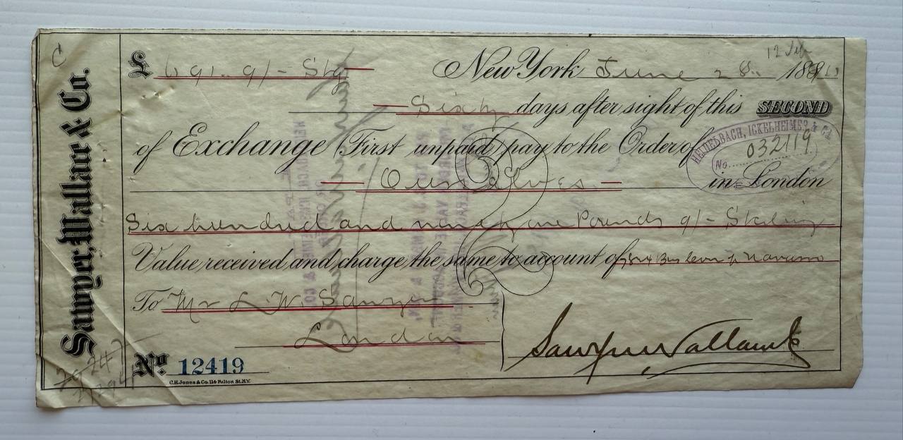 Historic financial document issued in New York and payable in London. With impressive red underlining and typeface, this piece represents U.S.-UK trade ties at the end of the 19th century. Noted for aesthetic typography and well-preserved condition.