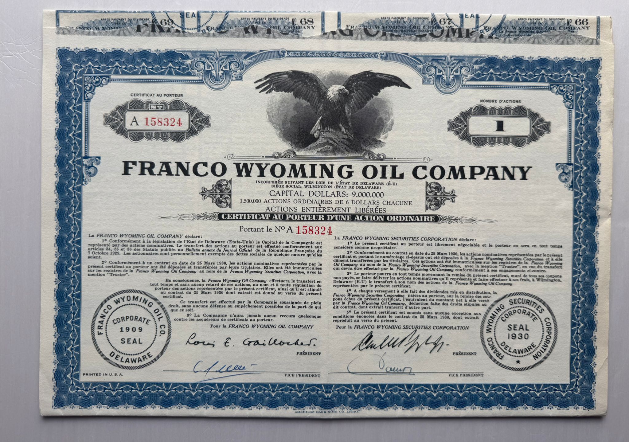 Highly attractive bearer share certificate from the Franco Wyoming Oil Company, Delaware, 1930. Eagle vignette, blue border, corporate seal. A classic U.S. oil scripophily item. Issued for 1 share with facsimile signatures of directors.