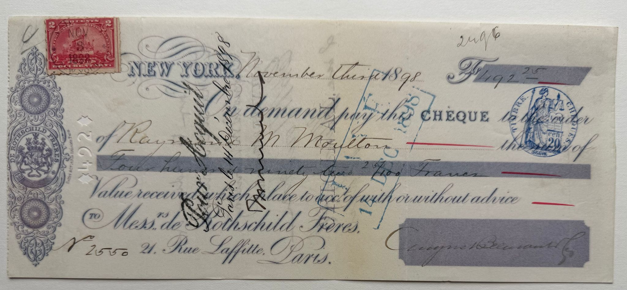 Original 1898 cheque drawn by August Belmont & Co. on Rothschild Frères, Paris, dated November 1st, 1898. Features blue and red ink detailing, ornate engraving, and the Rothschild coat of arms at left. Issued for 492.25 Francs and stamped ‘PAID’. August Belmont, a leading U.S. banker, served as the Rothschilds’ New York agent. Excellent cross-Atlantic banking collectible.