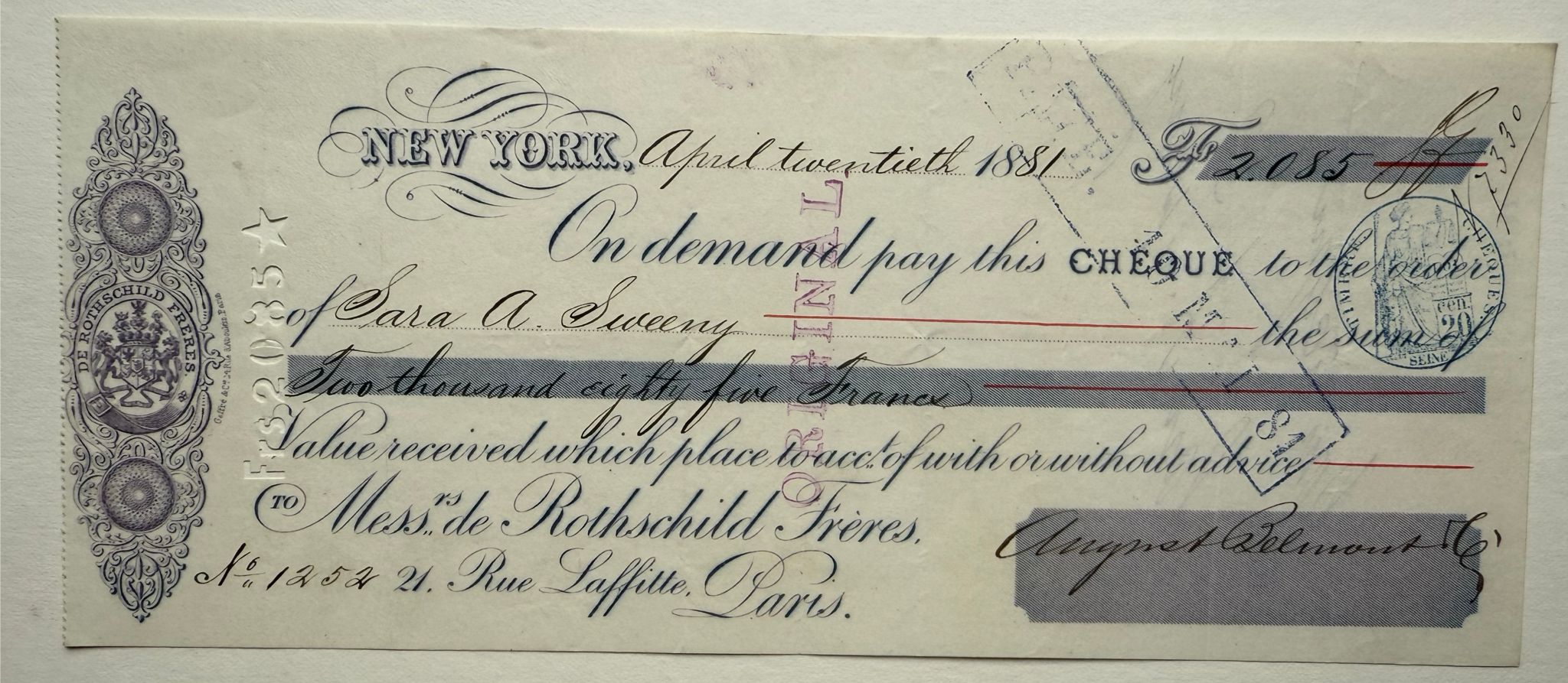 Attractive 1881 cheque from August Belmont & Co., New York, issued to Rothschild Frères, Paris, for 2085 Francs. Printed in fine steel engraving by the American Bank Note Co., with the Rothschild family arms at left and elegant calligraphy. Dated April 20th, 1881, and marked ‘PAID’. A fine example of early international settlement between the American and French banking elites.