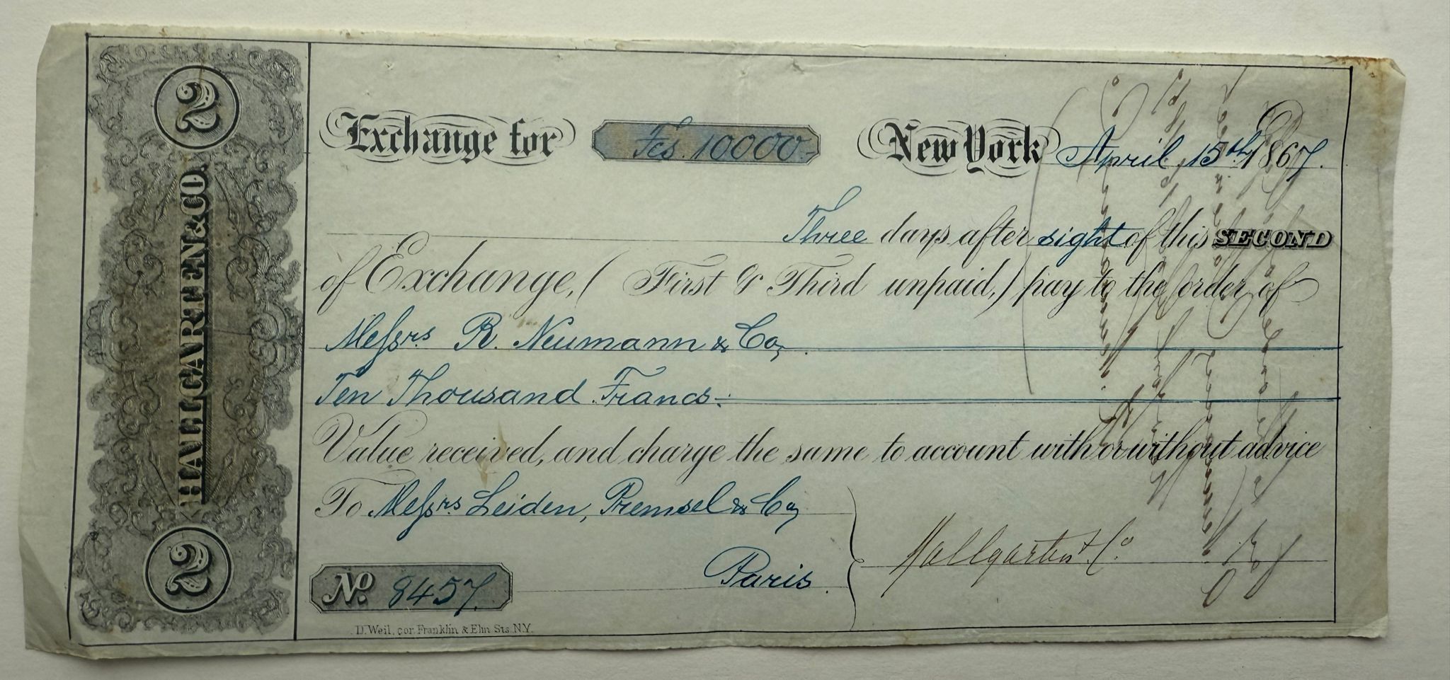 Original 1867 Hallgarten & Co. bill of exchange issued in New York and drawn on Paris for 10,000 Francs. Hallgarten & Co. was a major 19th-century banking firm active in international finance. Elegant typographic design, a fine collectible of transatlantic trade.