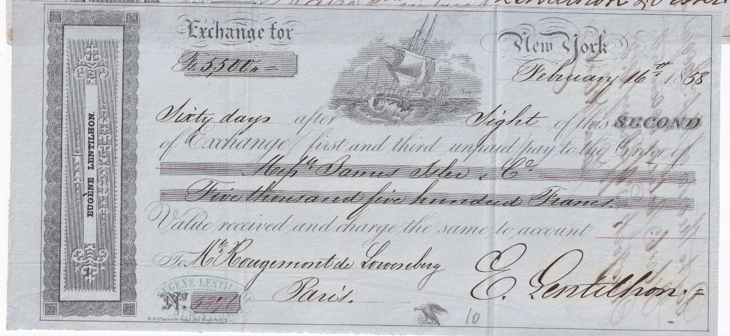 Early 1858 bill of exchange issued by Eugène Lentellhon of New York to Rayment & Grossberg, Paris. Decorated with a sailing ship vignette and detailed border. An appealing mid-19th-century trade document representing early transatlantic commerce.
