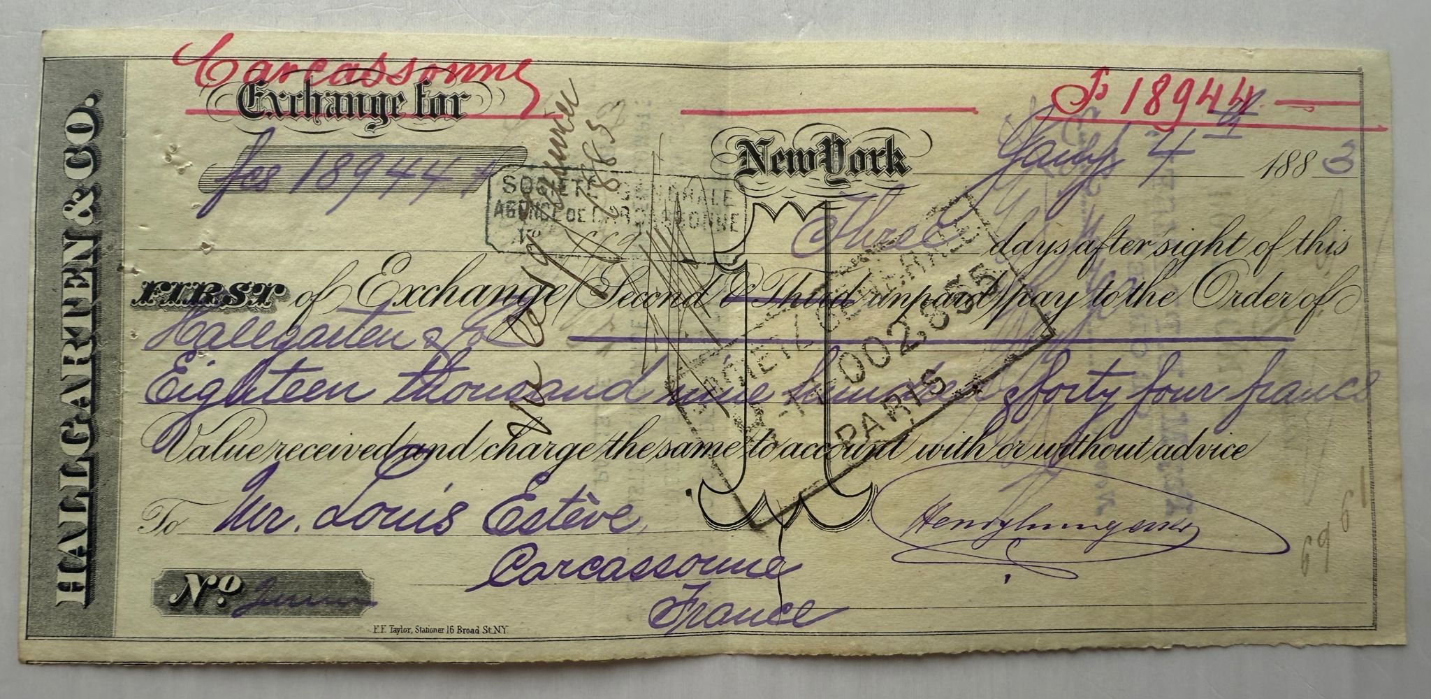 Rare 1883 Hallgarten & Co. bill of exchange payable in Carcassonne, France, for 18,944 Francs. Features multiple cancellations and endorsement marks. A fascinating piece illustrating French provincial trade financed through New York banking houses.