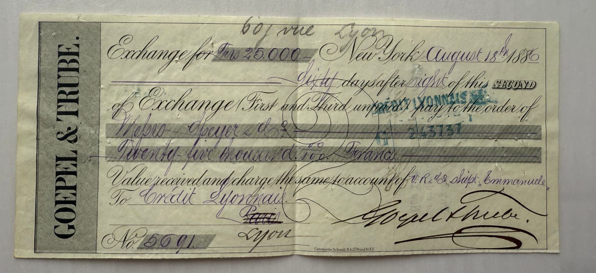 Matching 1886 Goepel & Trube bill of exchange, ‘Second of Exchange, ’ complementing the first issue. Endorsed and marked by bank stamps. Rare survival of a complete financial instrument set used in transatlantic trade.