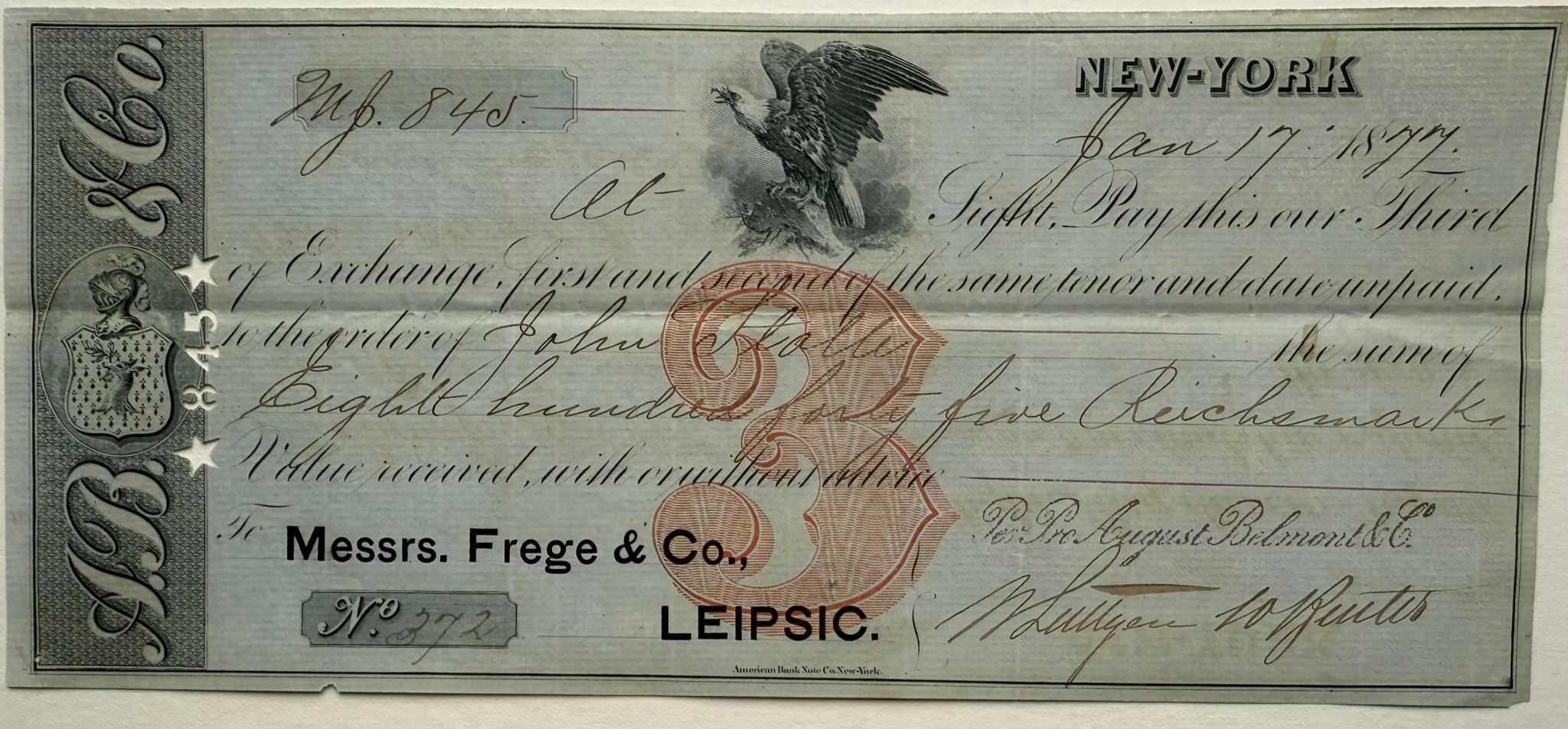 Elegant third of exchange issued by August Belmont & Co., a premier New York banking house, in favor of John Tholen for 845 Reichsmarks, payable by Messrs. Frege & Co. in Leipzig. Printed by American Bank Note Co., featuring a large ornate red “3,” a heraldic crest, and an eagle vignette. A beautiful example of transatlantic financial documentation from the Gilded Age, highlighting U.S.-German commercial ties and hetitage of Jewish German bankers at Wall Street