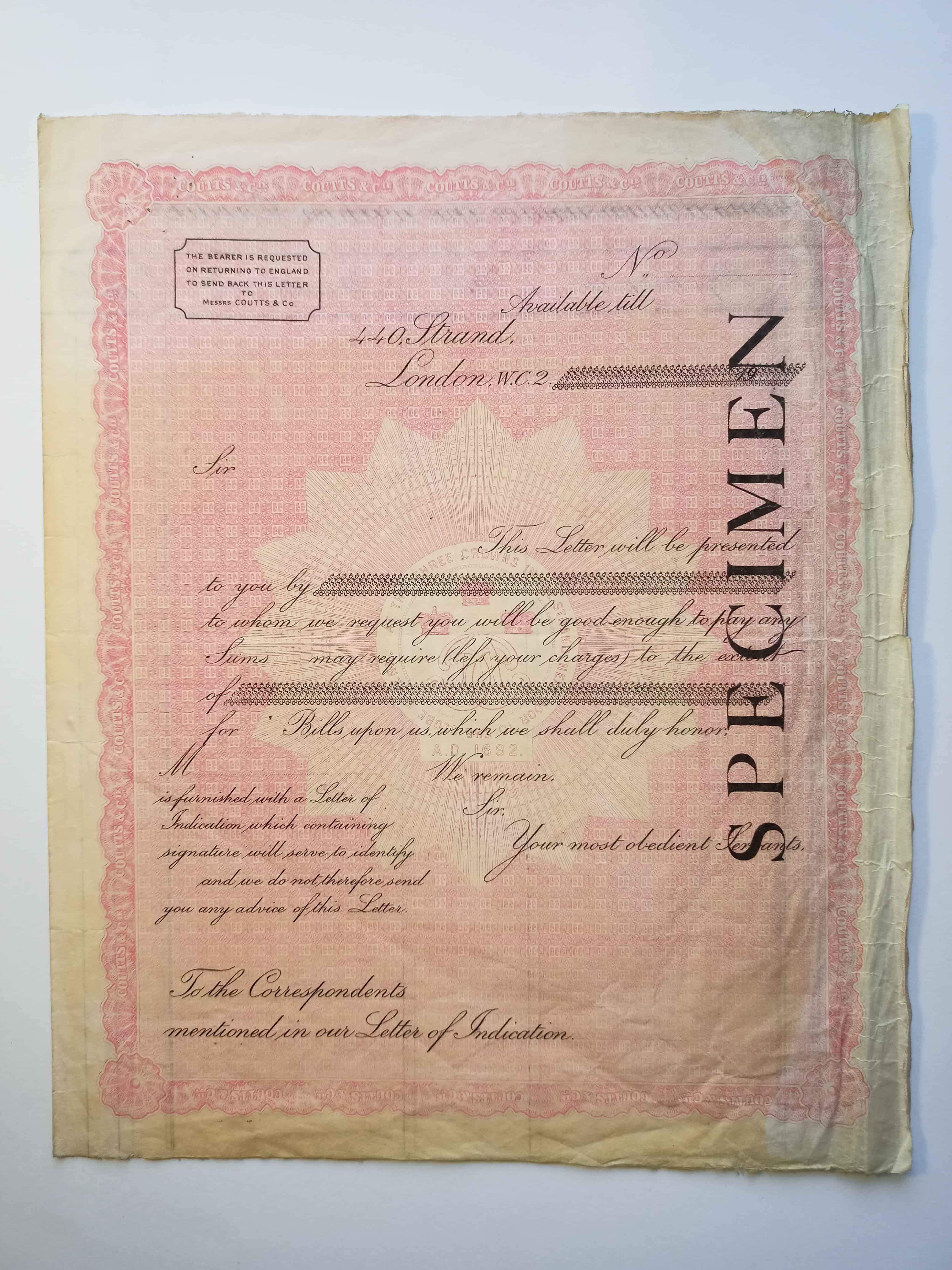 Large pink specimen letter of credit issued by Coutts & Co., London, undated. Elegant guilloche design with pre-printed specimen text. Coutts, the prestigious private bank serving British royalty and elite clients, issued such letters for overseas travel finance. A refined and decorative banking collectible.