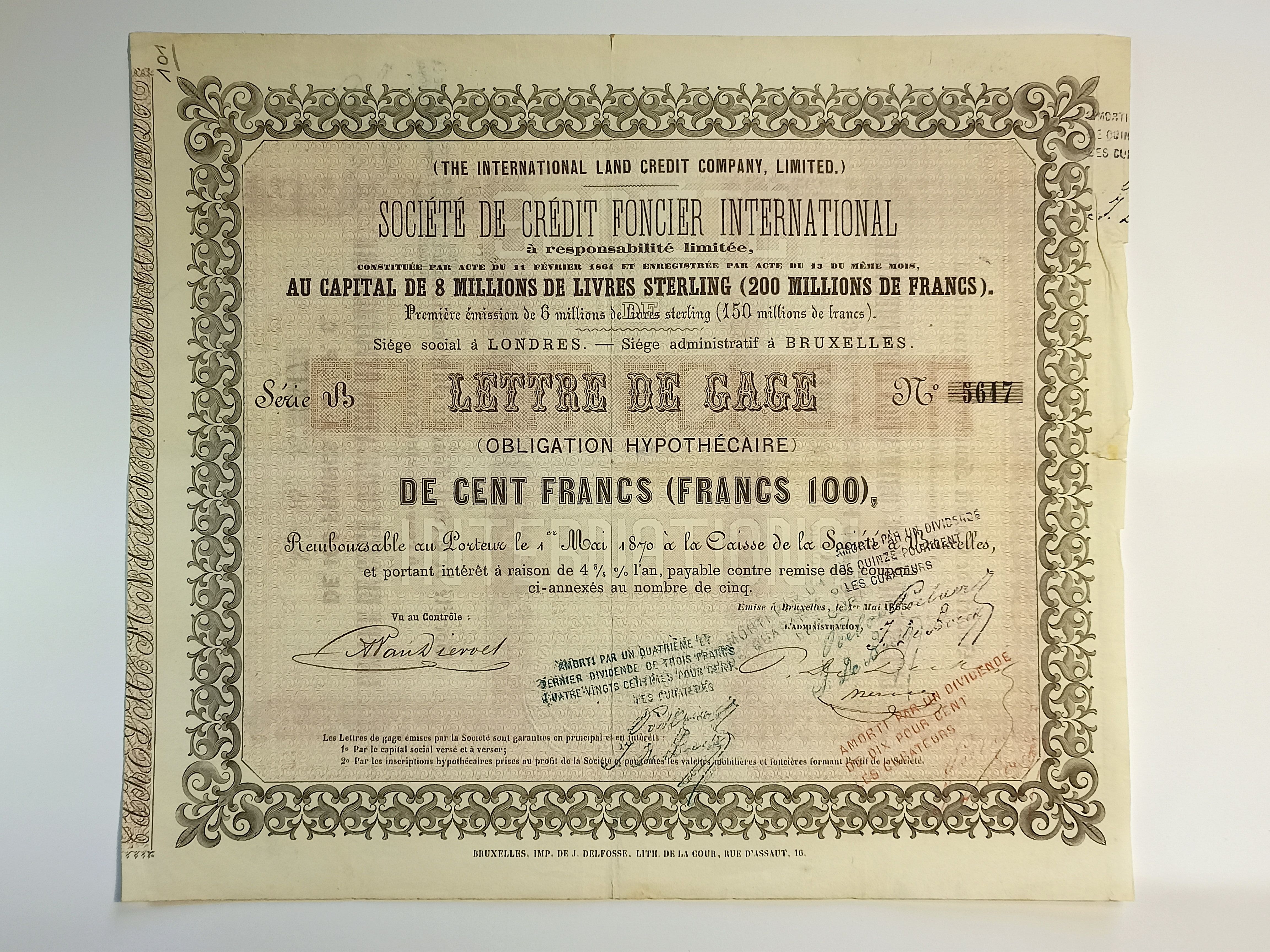 Early and impressive mortgage bond (Lettre de Gage) issued by Société de Crédit Foncier International, with administrative offices in Brussels and London. Dated 1863, denomination 100 Francs. Rich with handwritten annotations and signatures. This institution was closely associated with Baron Maurice de Hirsch (1831–1896), a German-Jewish financier and philanthropist who amassed a fortune in railway and banking ventures and became one of Europe’s most prominent benefactors. De Hirsch was renowned for funding Jewish education and agricultural colonization through the Jewish Colonization Association, supporting the migration of Jewish communities to the Americas. A rare financial artifact linking 19th-century international mortgage operations with one of the era’s most influential figures in global finance and philanthropy.